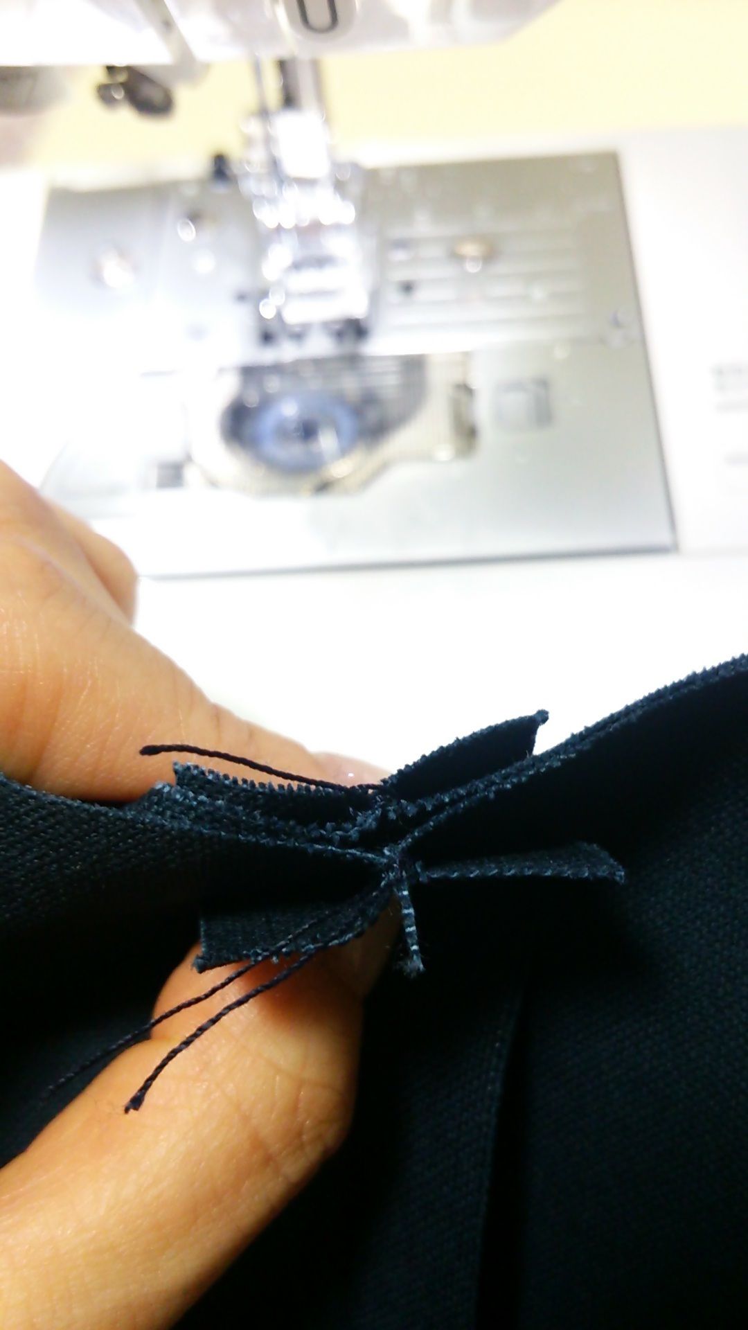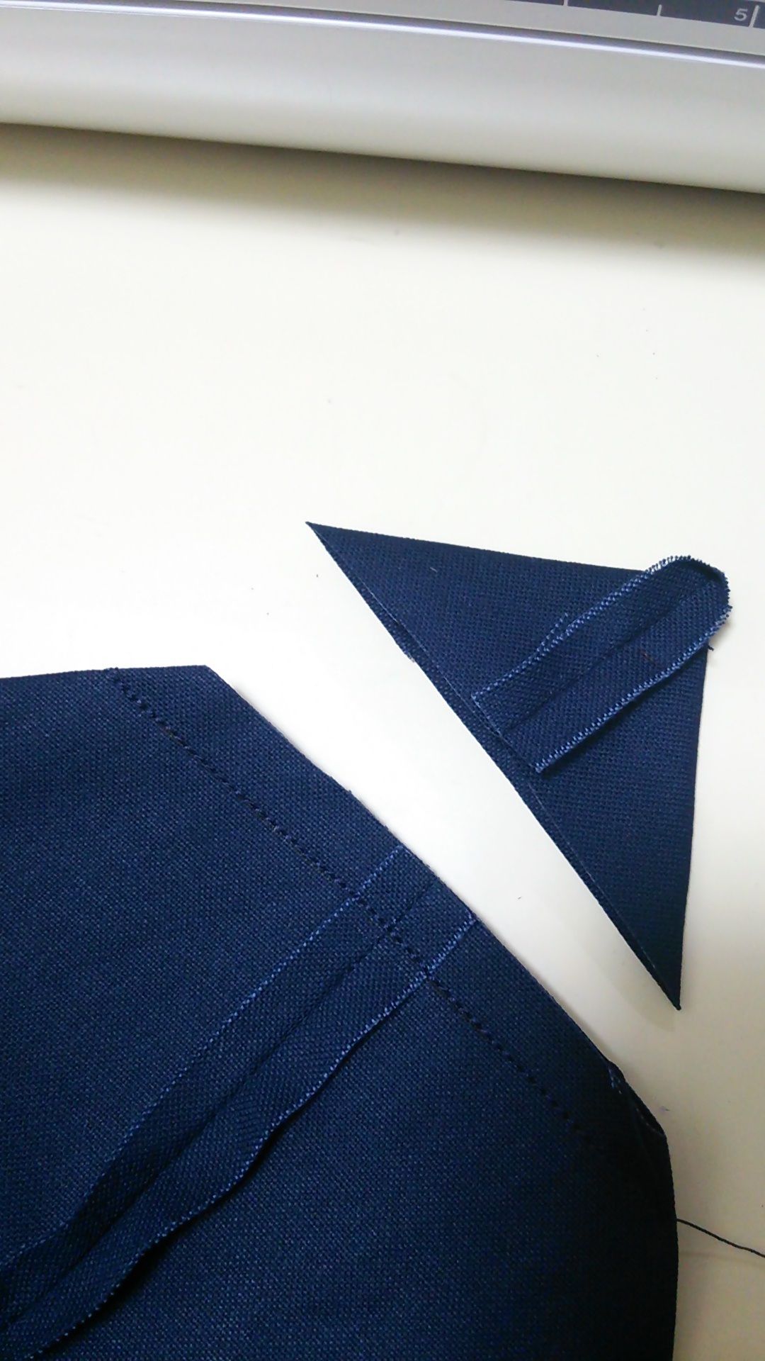 三角に摘まんで縫うのですが、脇の縫い代を開き、真ん中に来るようにしましょう。