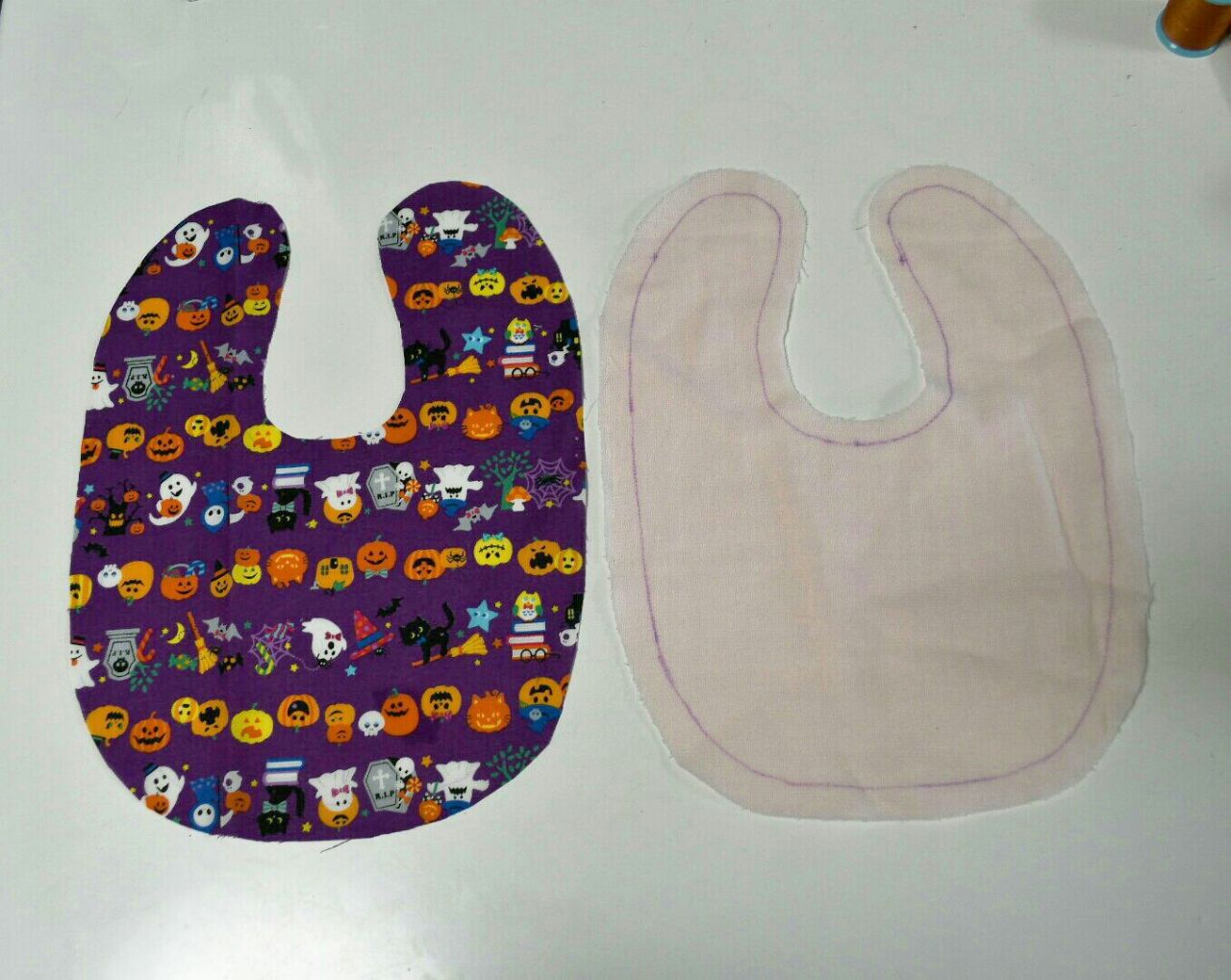 ①表の柄生地と裏のタオル生地を1枚ずつ裁断します(縫い代1cm)