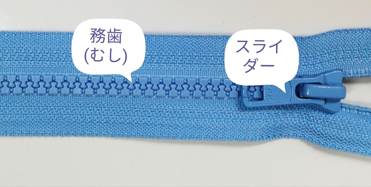 ファスナーのレールの部分を務歯(むし)、