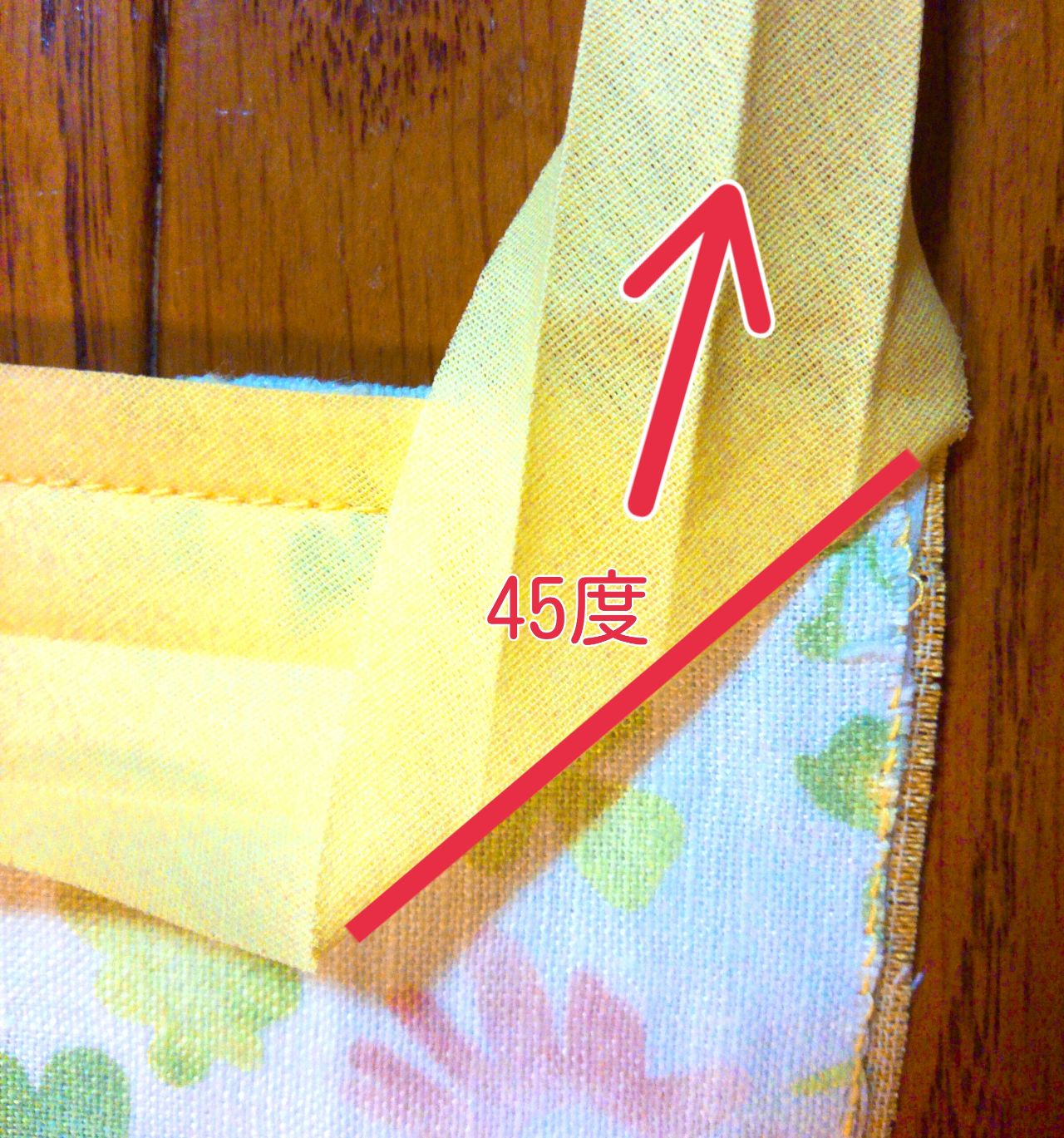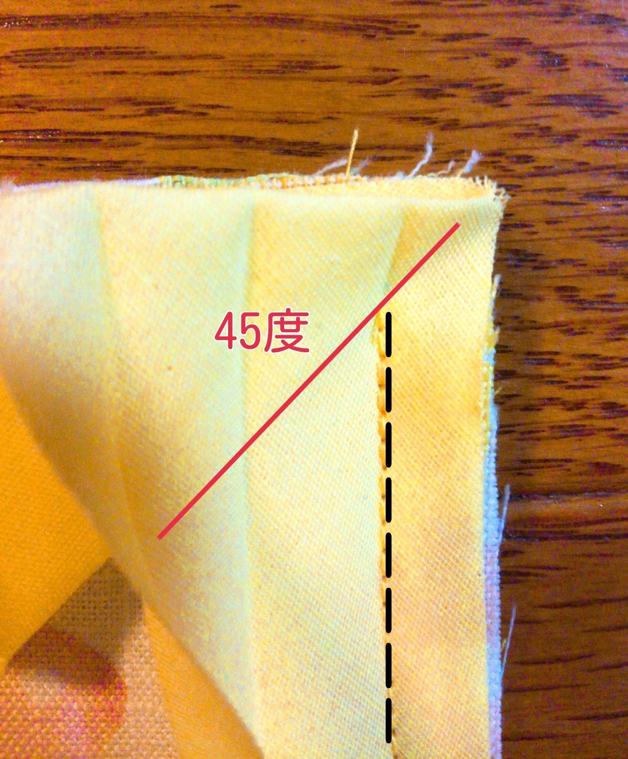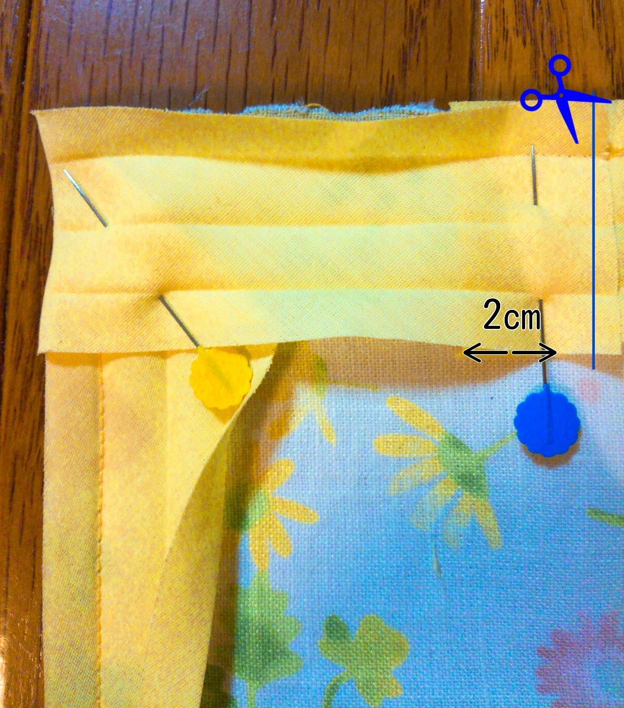 角に近付いてきたら、バイアステープの縫い代と同じ幅の所で縫い止めます。