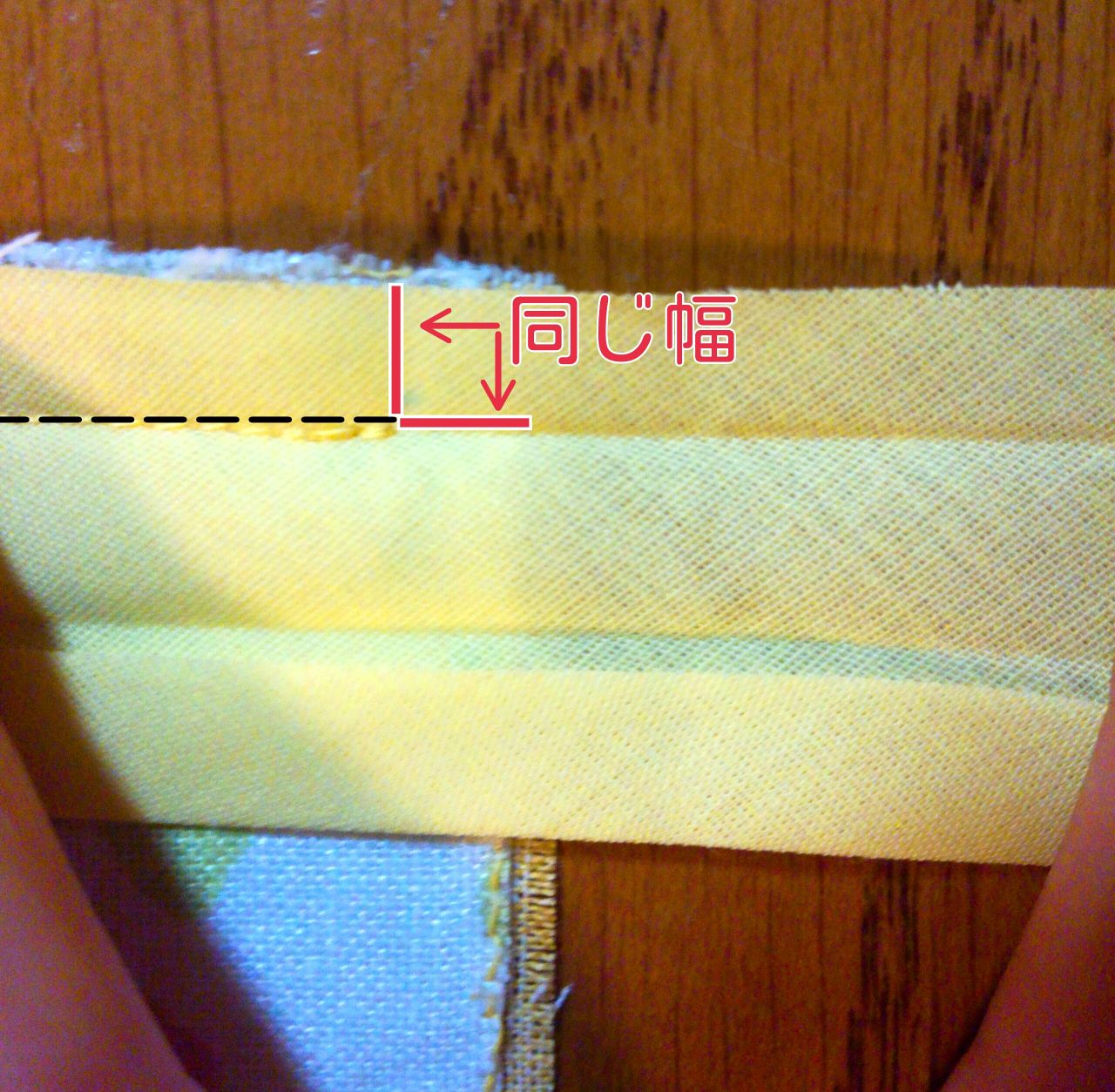 1. バイアステープの半分に折った状態で、幅の短い方を表にくるようにします。