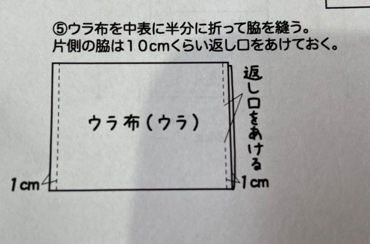 ⑤ ④を上端を合わせ中表半分に折って両脇を1cmで縫う。下の写真