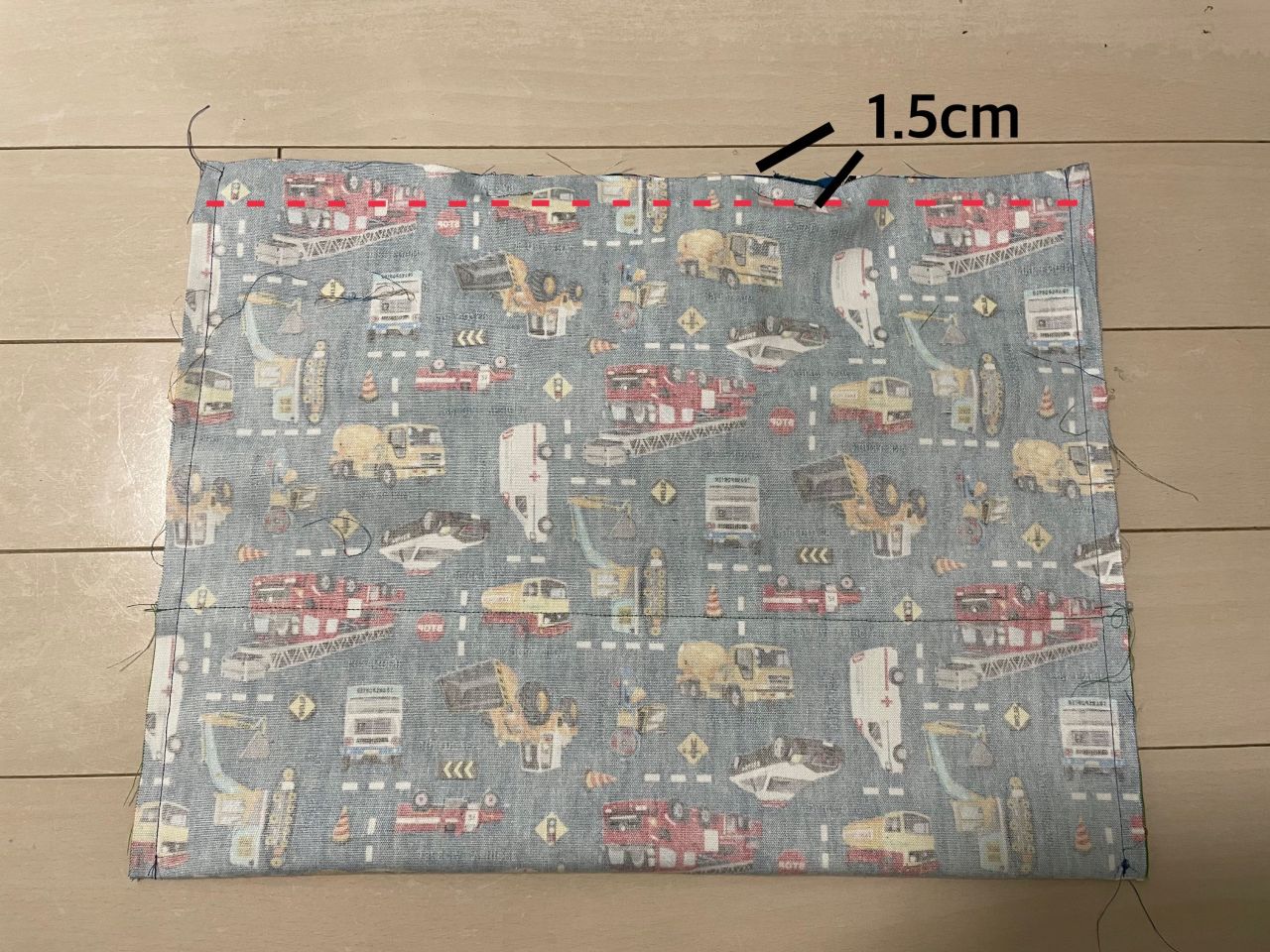 ⑦袋口を合わせて1.5cmのところを1周ぐるっと縫う。