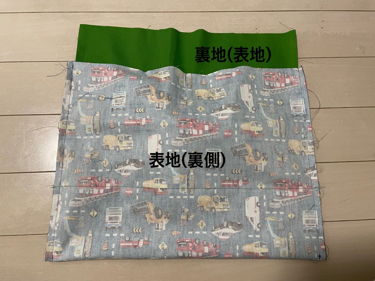 ⑥裏布を表に返し裏地を中表にして表地に入れ込む。