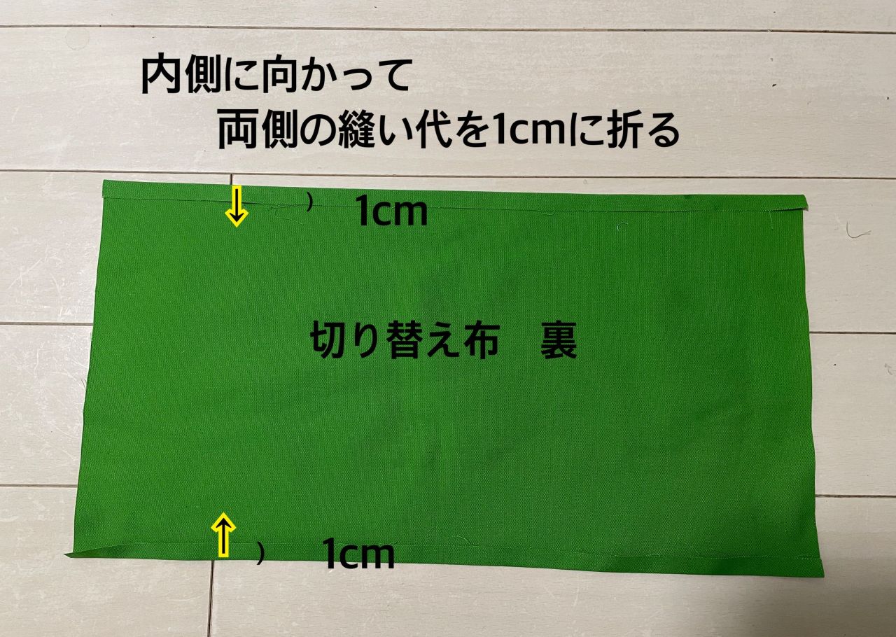 ②切り替え布の縫い代を1cm、アイロンで折る。