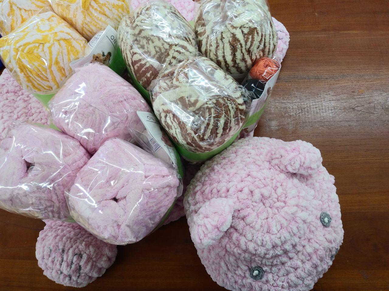 スーパーハッピーシェニール3玉と目等の顔パーツはハッピーコットンで編みます。