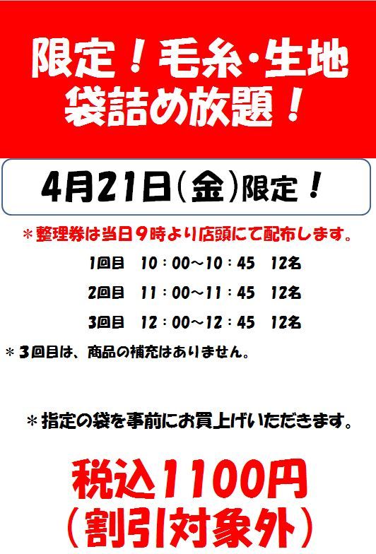 4/21(金)オカダヤ町田店限定♪毛糸&生地袋詰め放題イベント開催!!