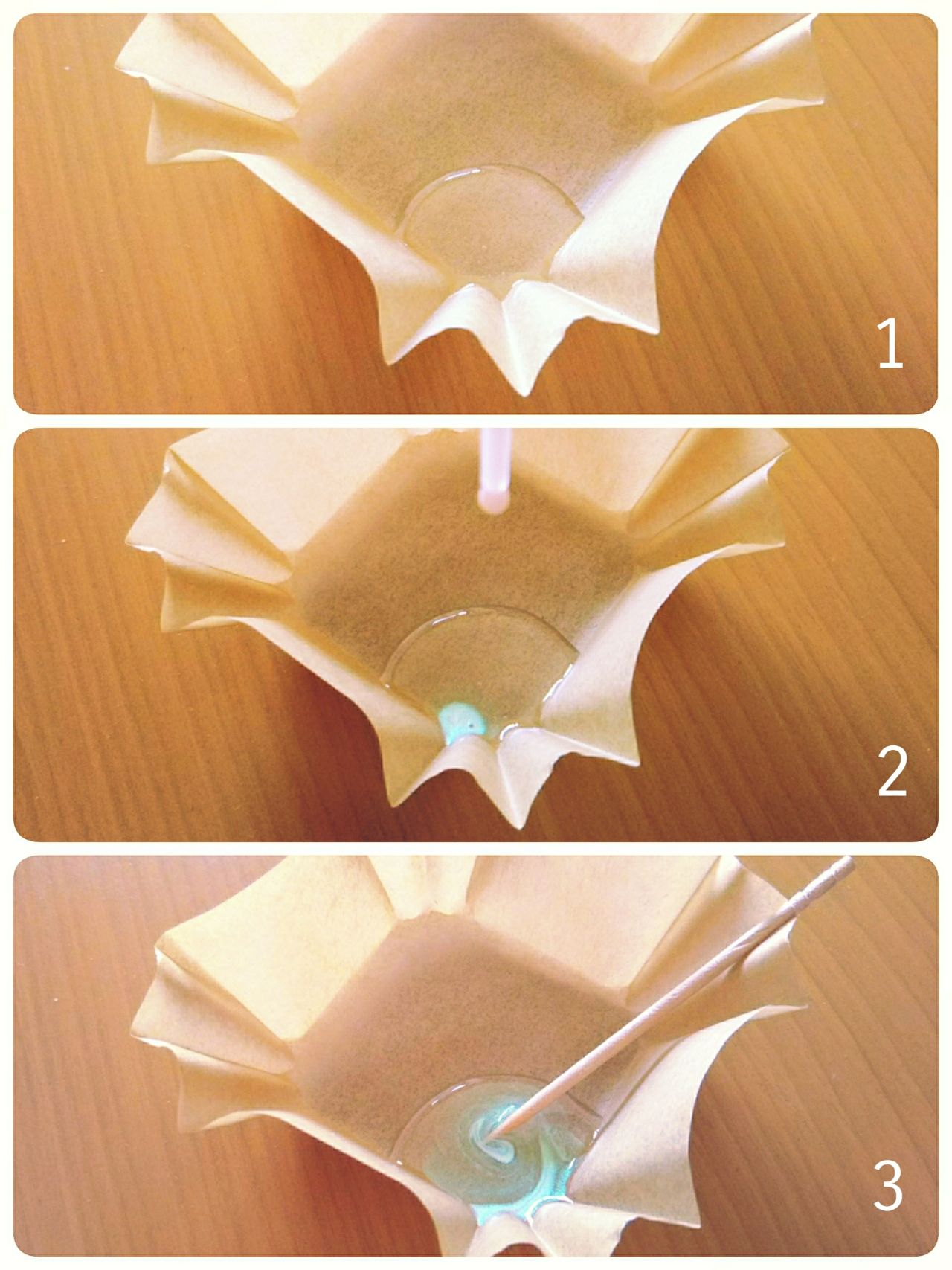 1.おかずカップの上にティースプーン一杯程度のレジン液を入れます。