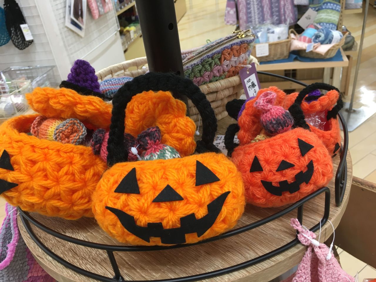 中段は、ハロウィンのカボチャ達、 アクリル毛糸で編んであります。