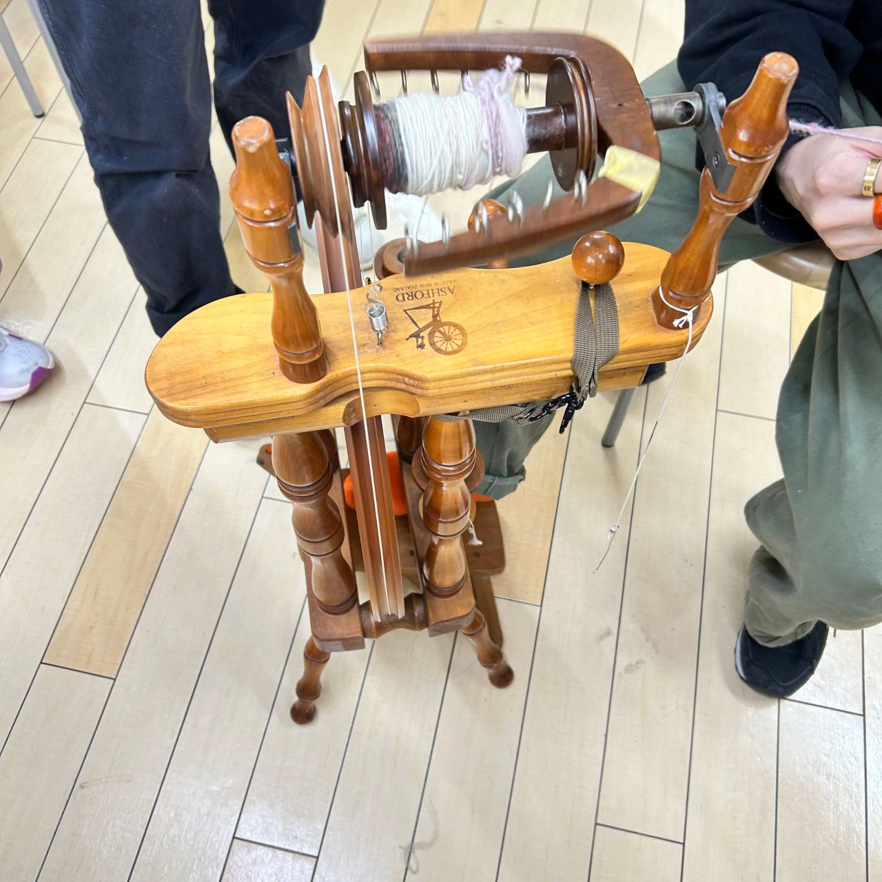 足のタイミングと手の力加減に気を付けながら羊毛を毛糸にしていくことに「むずかしい〜」と苦戦されながらも真剣な表情で紡いでおられました。