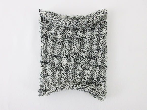 太さが均一ではない黒い毛糸が巻き付いていることで、編み時に立地感が生まれたように見える、不思議な毛糸です。