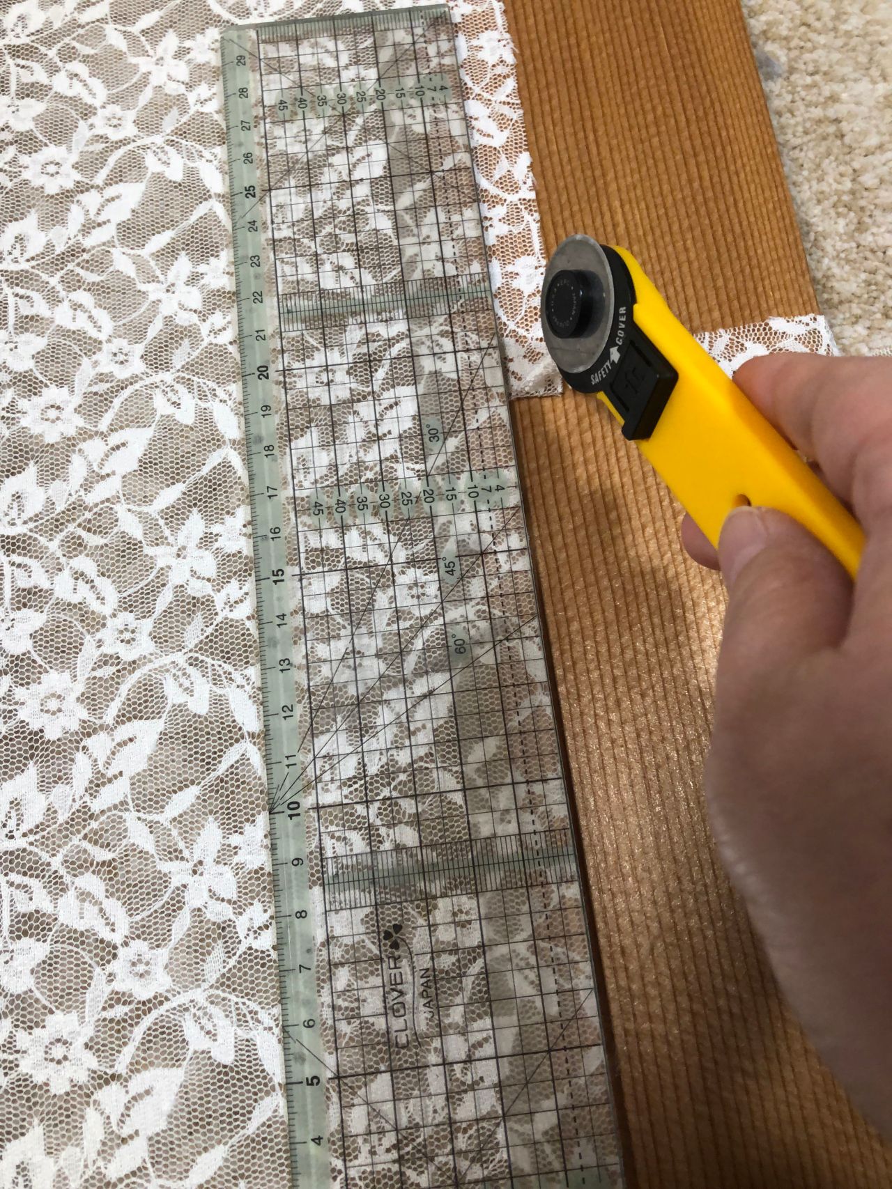 ⑤枠からはみ出している生地をロータリーカッターで切ったら完成です。