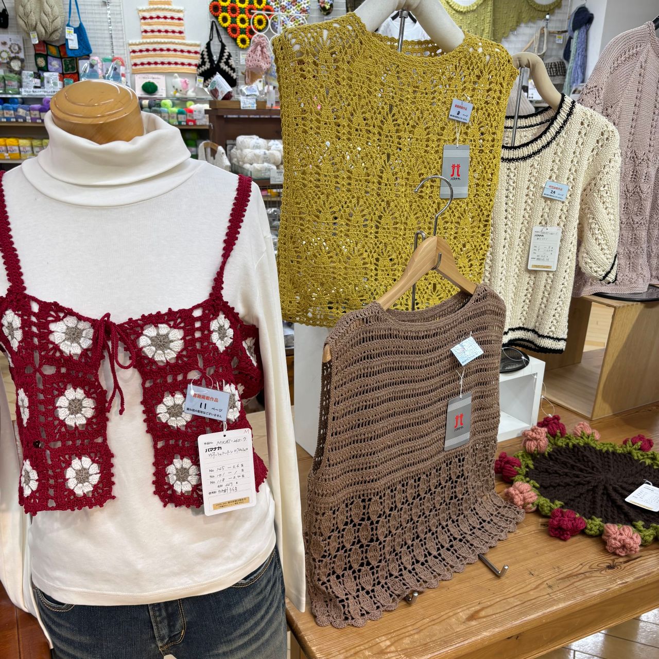 人気のハマナカ毛糸を使用した、春夏に着たいプルオーバーやベストに加えバックや帽子など今編みたいニット春夏号掲載の素敵な手編み作品を展示中です。