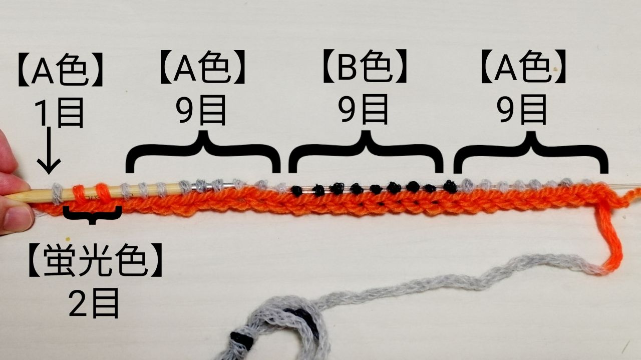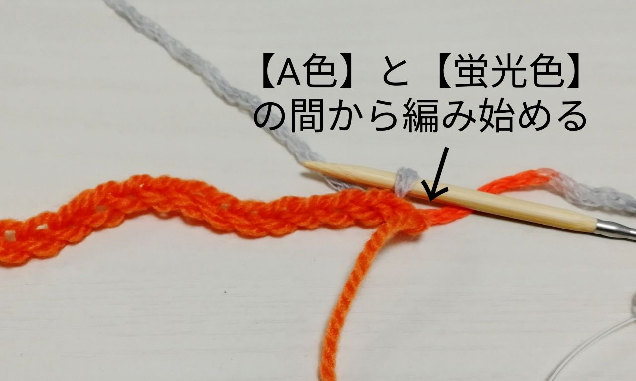 作り目から{【A色】9目+【B色】9目+【A色】9目+【蛍光色】2目}の順に30目拾います。