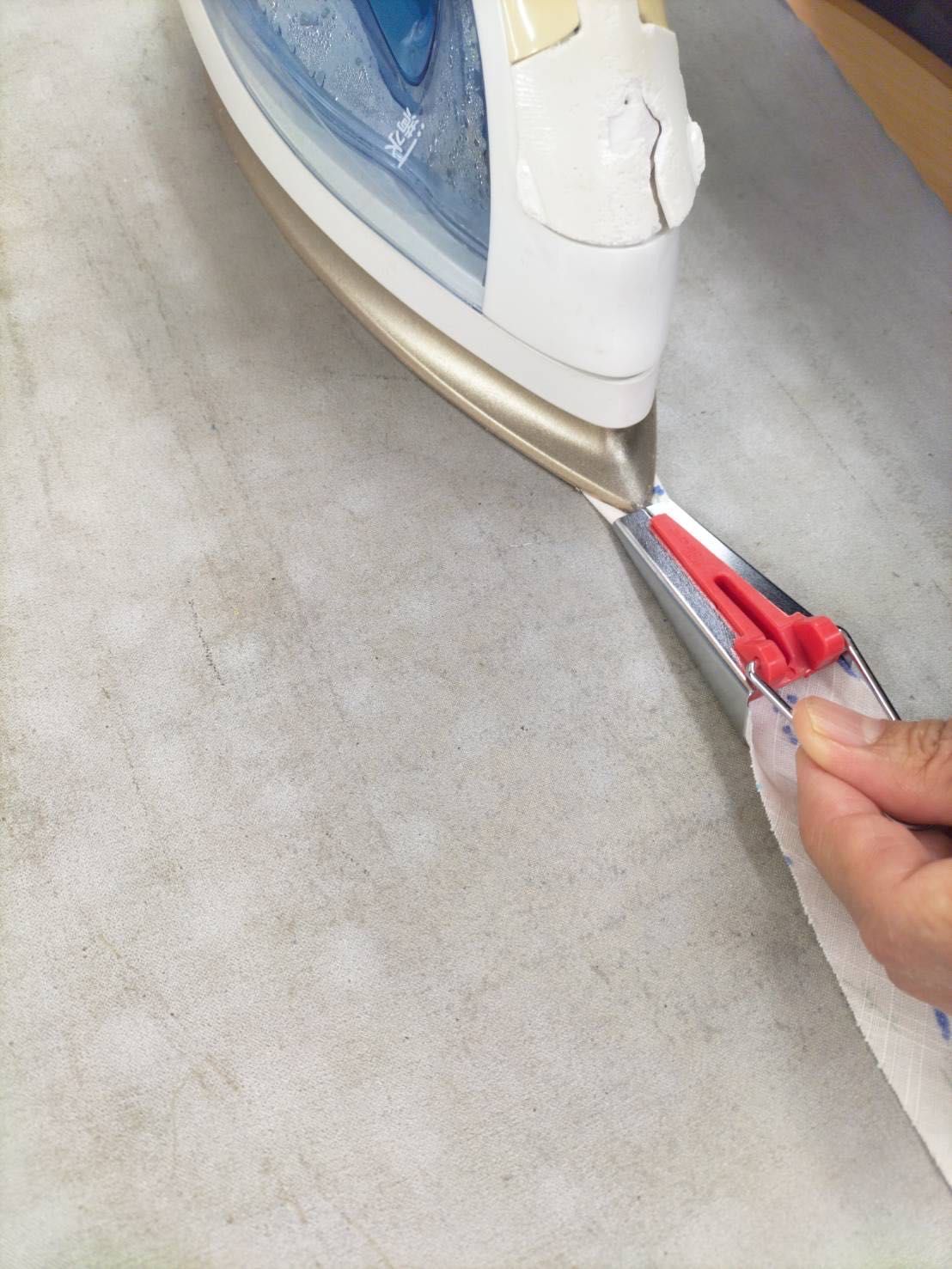 襟ぐりのバイアステープは、バイアステープメーカーを使って共布で作ります。