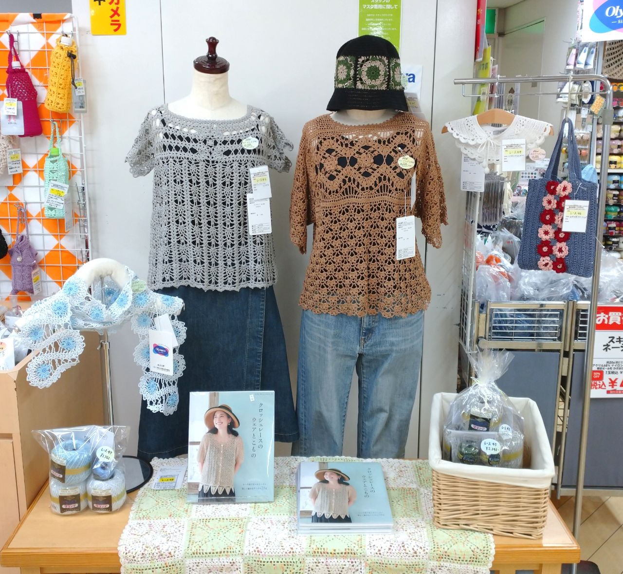 ▼書籍「クロッシェレースのウェアとこもの」より、ウェア2点とストールや帽子など小物を飾っています