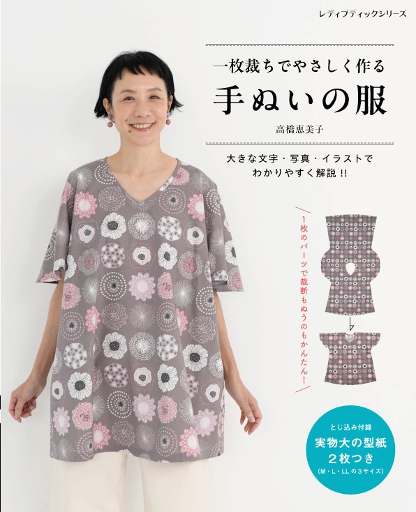 手ぬい作家高橋恵美子が提案する「一枚裁ち」の服。前、後ろ、袖がつながった一枚の型紙で作れるので、誰にでもかんたんに服作りが楽しめる。
