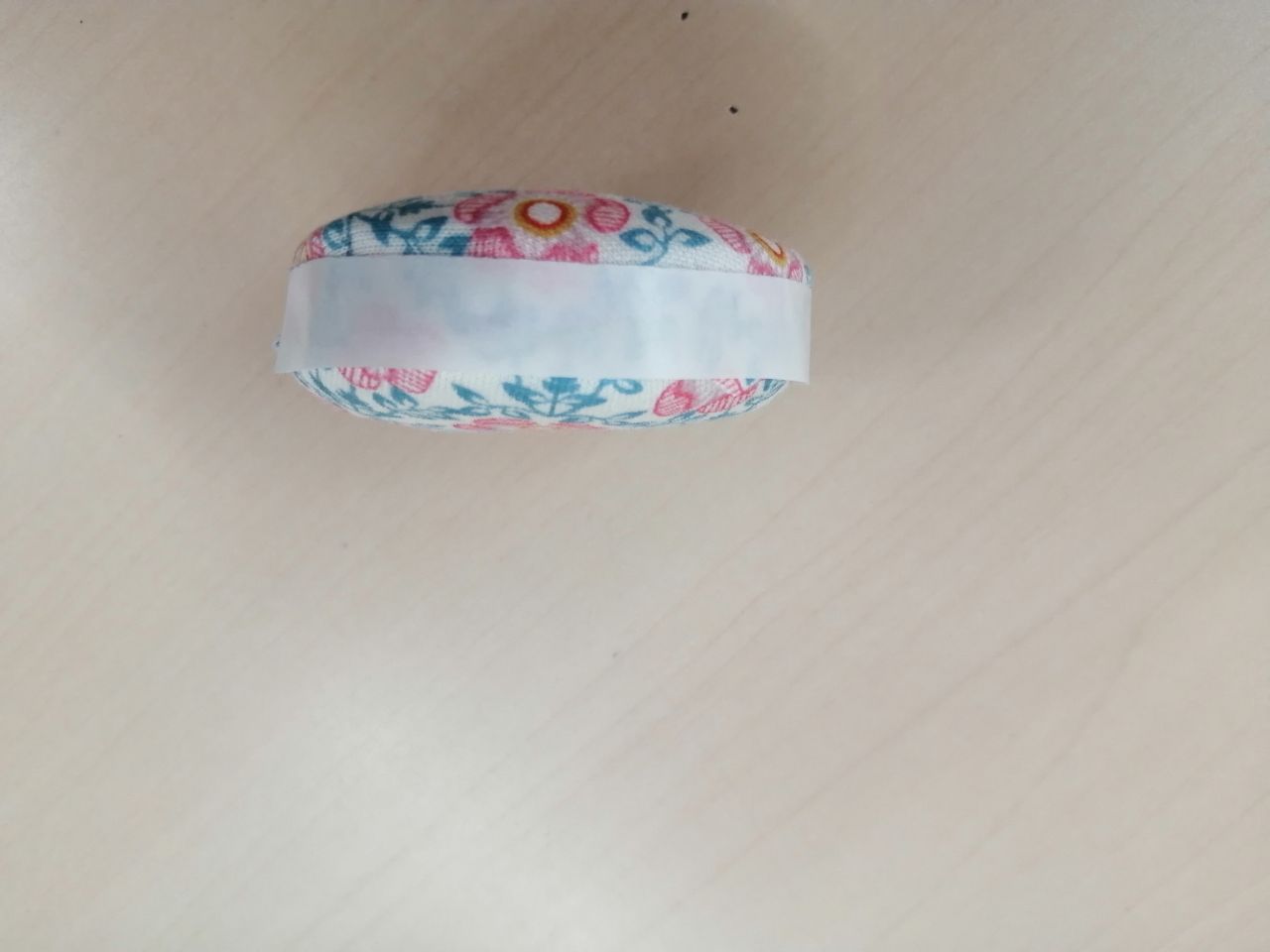キルト芯に2か所くらい両面テープをつけ、メジャーの側面にはぐるりと両面テープを巻き、片面ずつ貼っていきます。