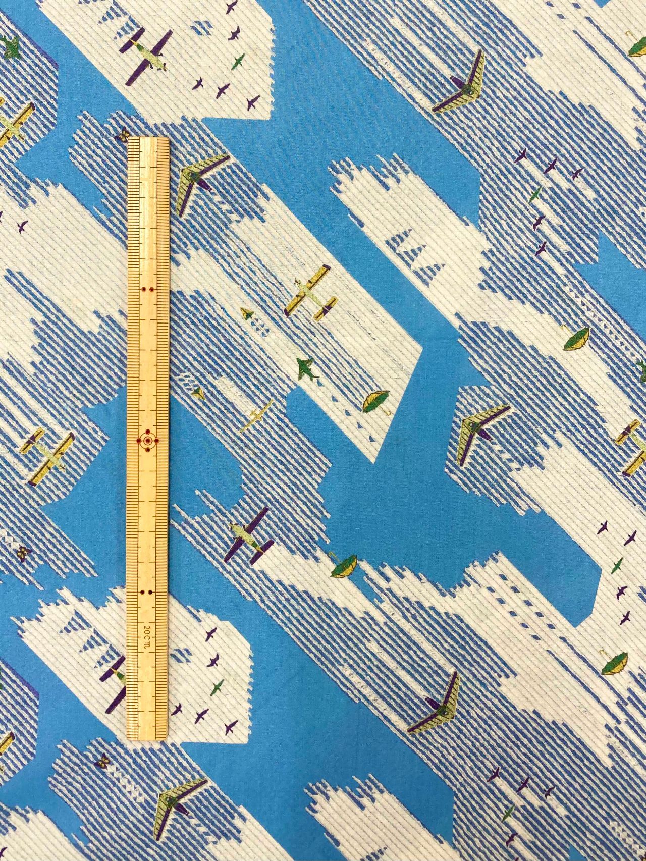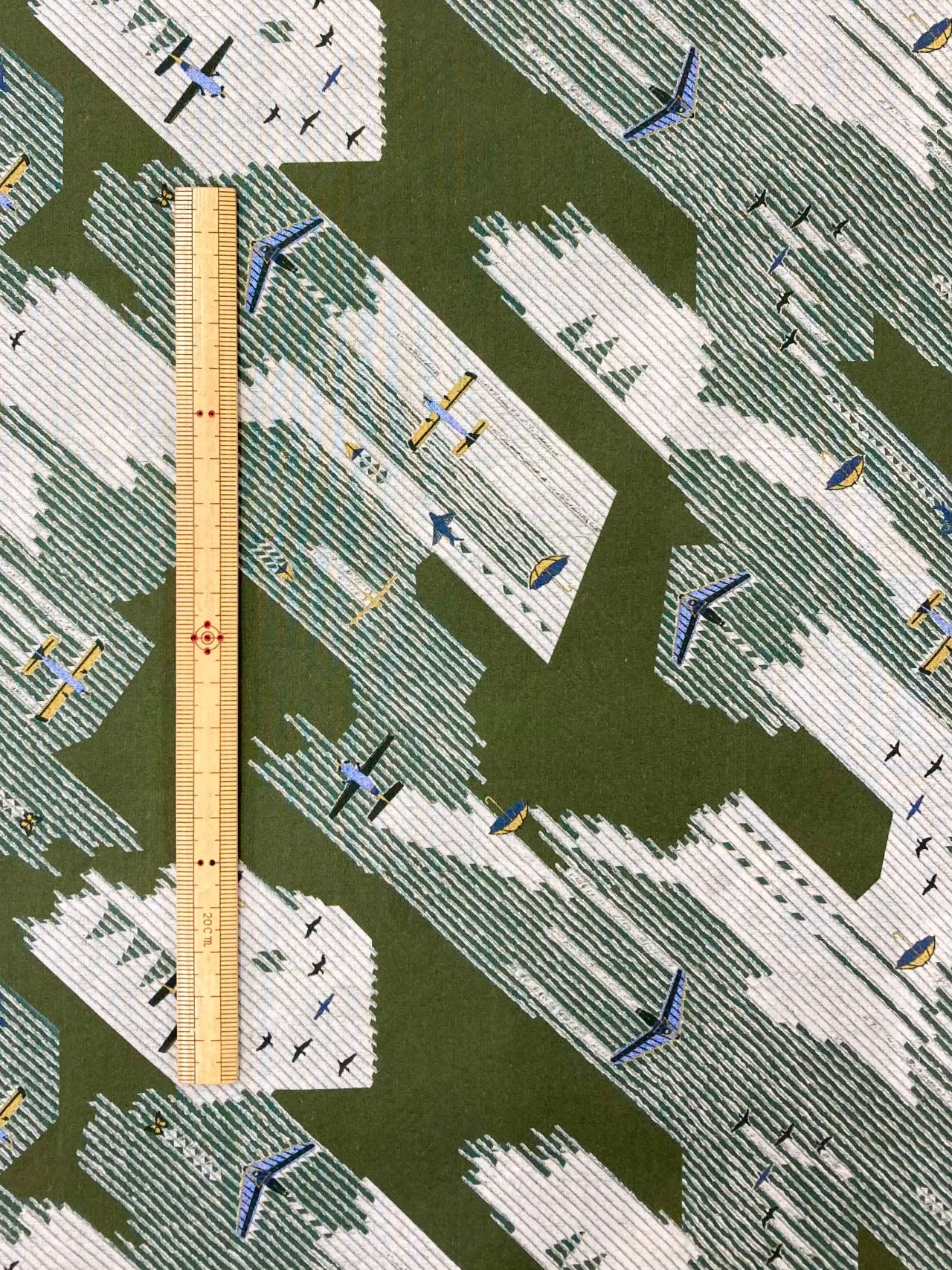 テキスタイルデザイナーである氷室友里さんにより、雲や飛行機が斜めにデザインされ、遊び心のある生地になっています。