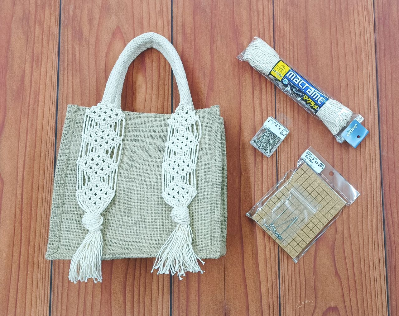 2枚のモチーフを編んで、ジュートバッグ土台に縫い付けています。製作したスタッフによるとモチーフ部分を編むだけなら数時間で出来たそうですよ。