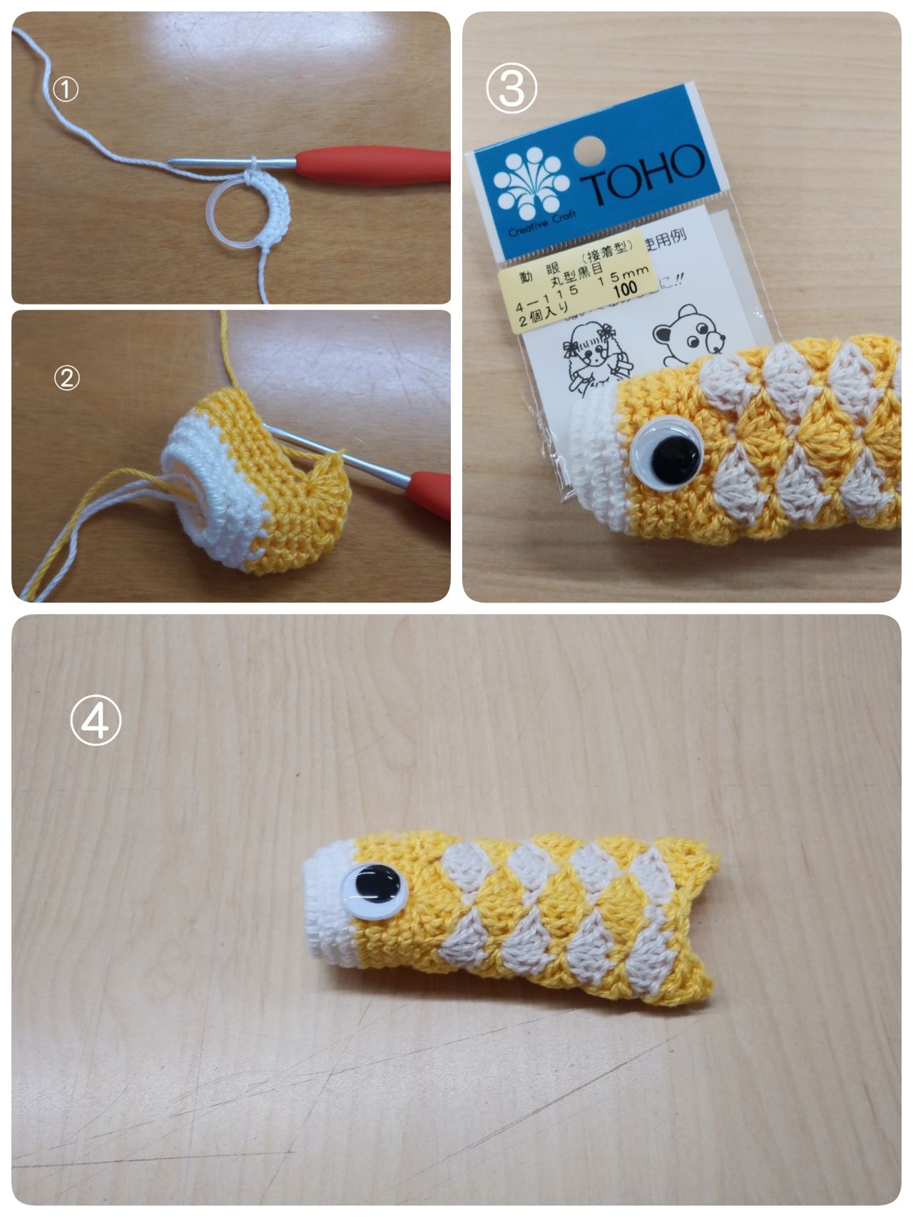 ①こいのぼりの口からハマナカニットリングを使って編み始めます。