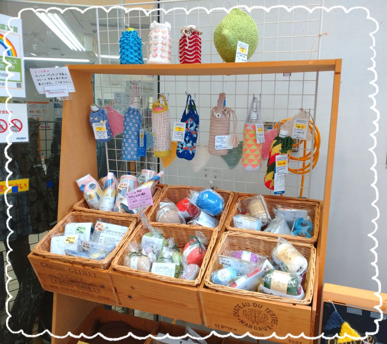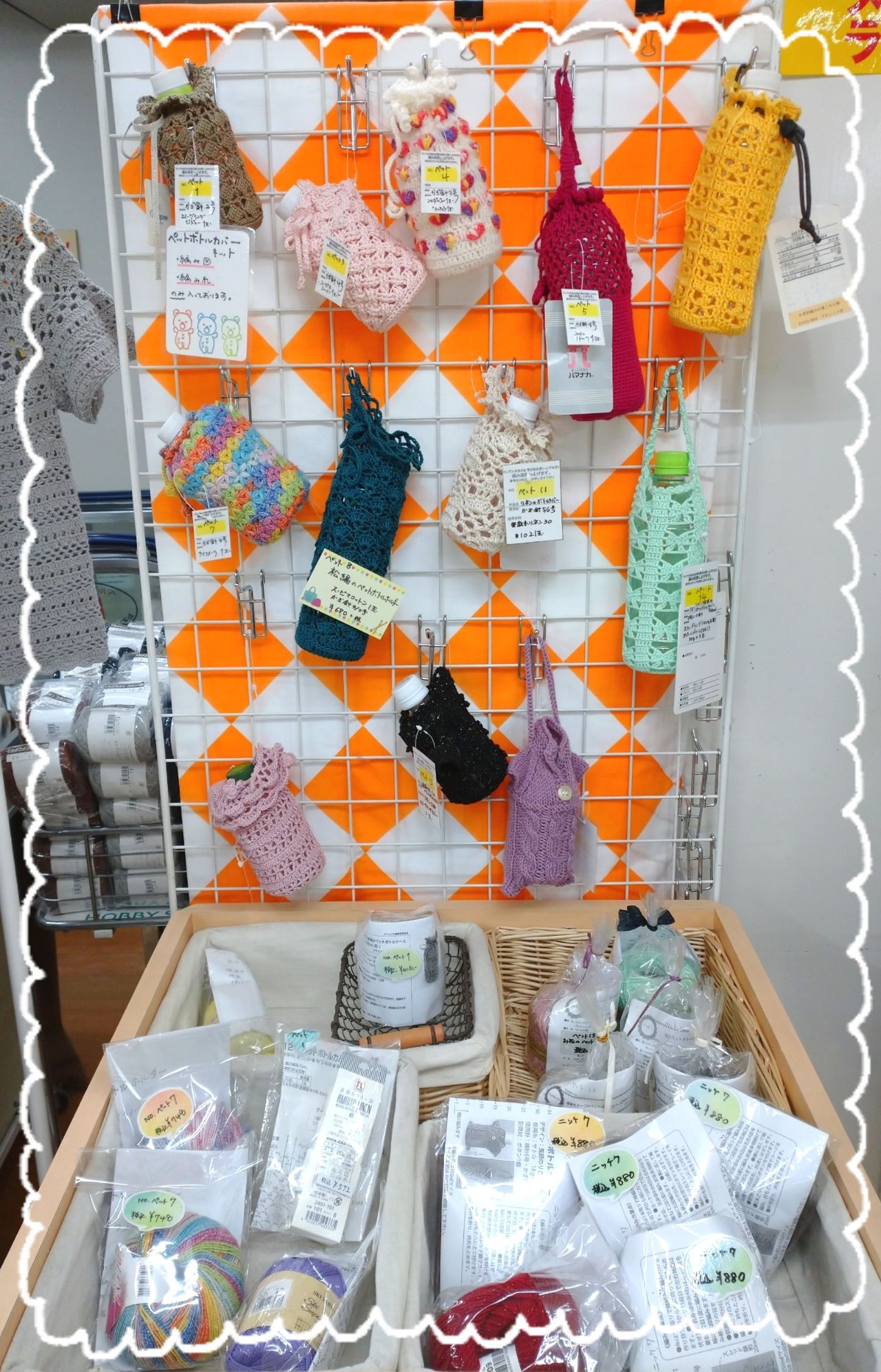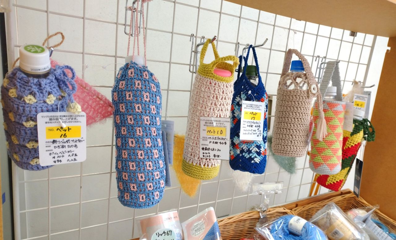 町田店入り口の木箱コーナーには、色々なデザインの「ペットボトルカバー」を展示中です☆
