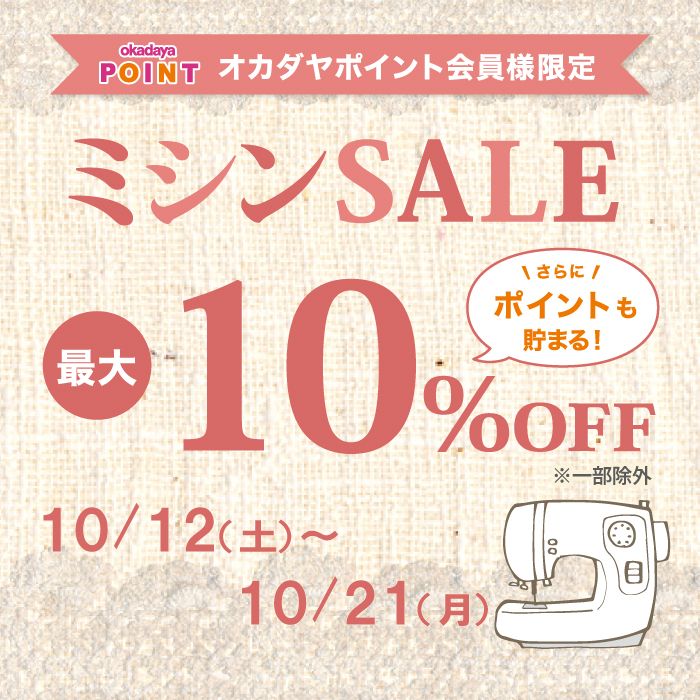 大変お買い得なミシンセールは10/12(土)〜10/21(月)です✩⡱:゚