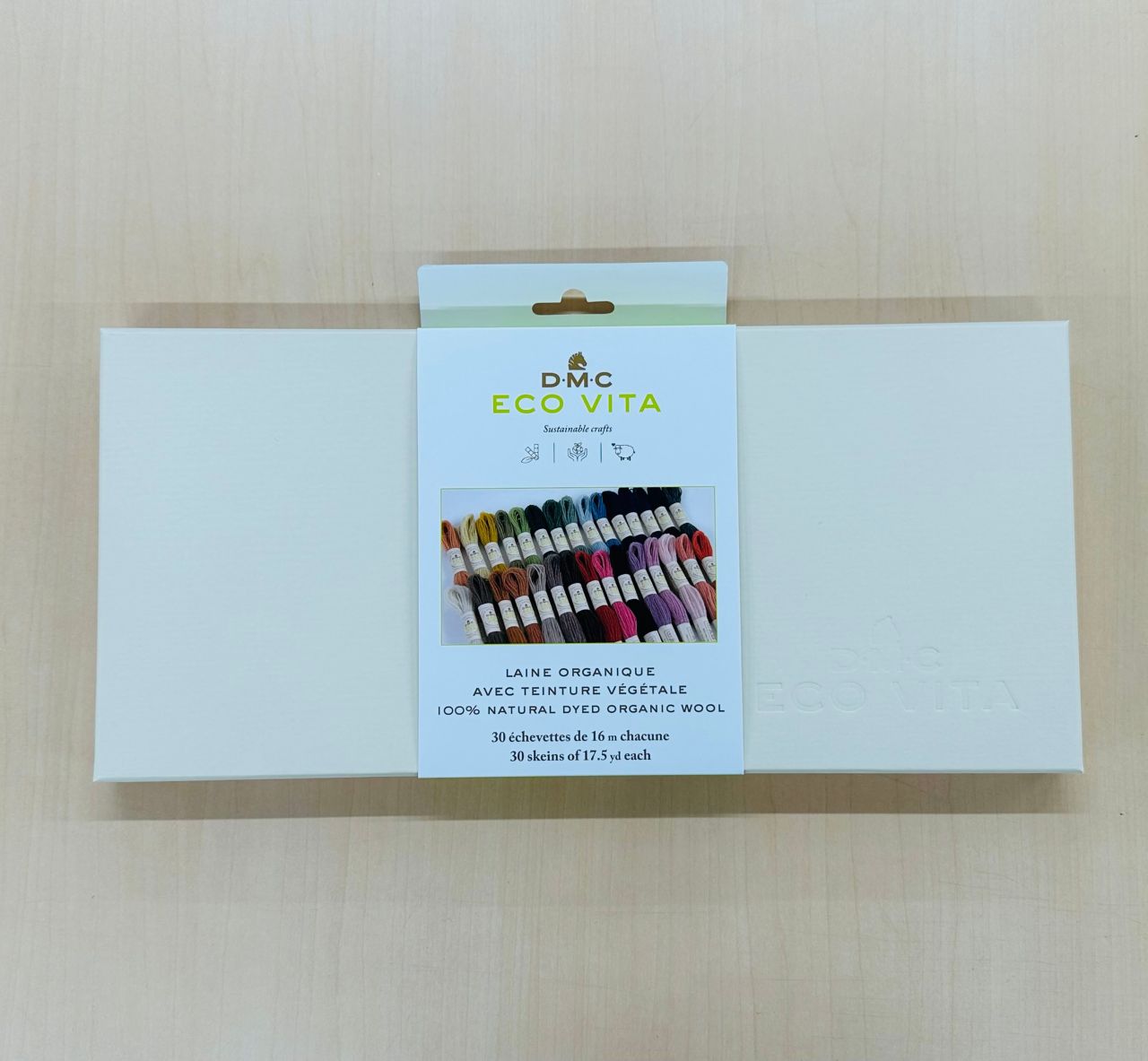 こちらのセットはECO VITA の総合的な風合いを楽しめるカラーが厳選されています。紙箱に糸30本2種類の図案が入っています。
