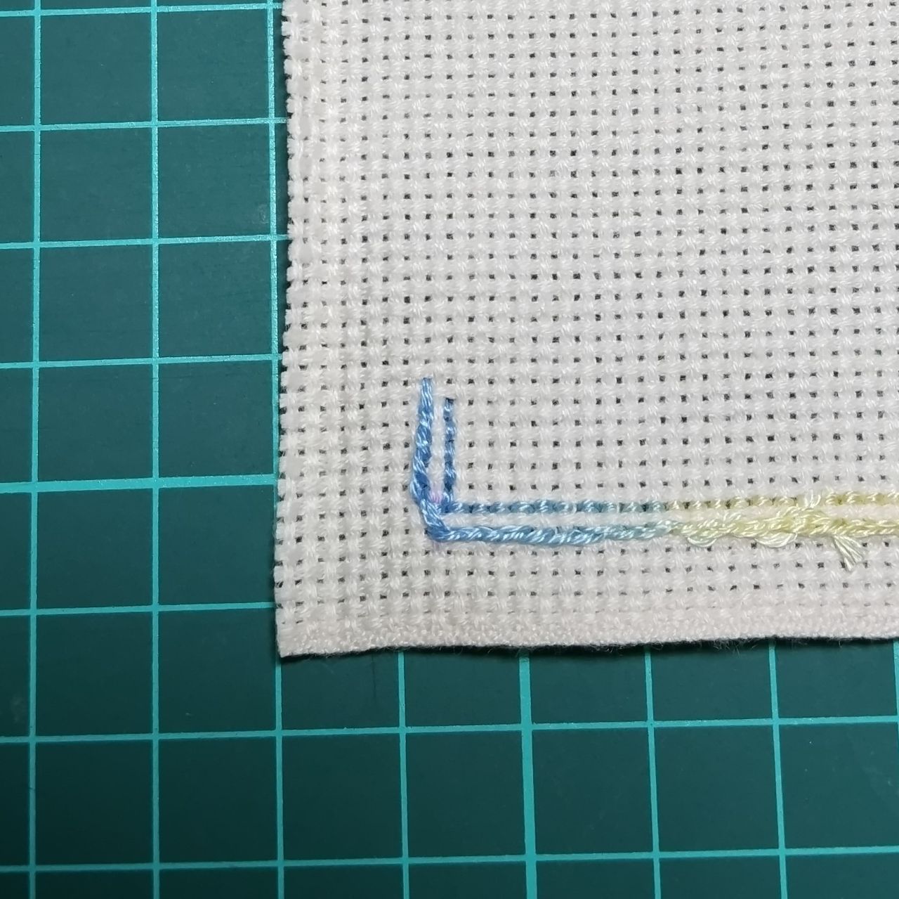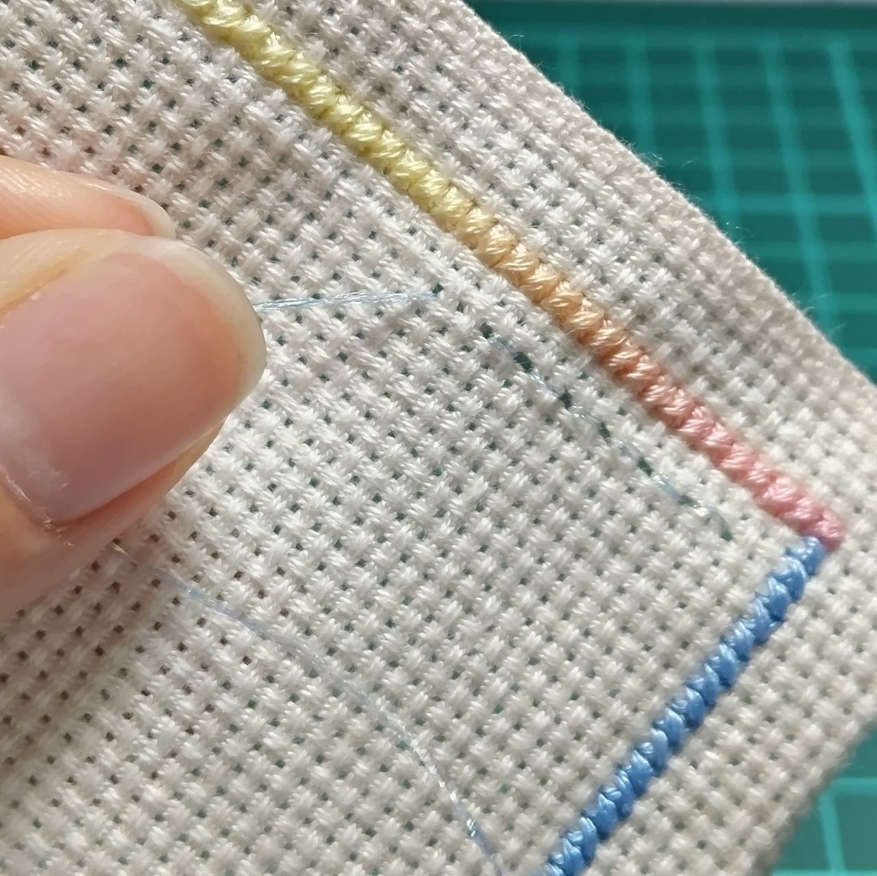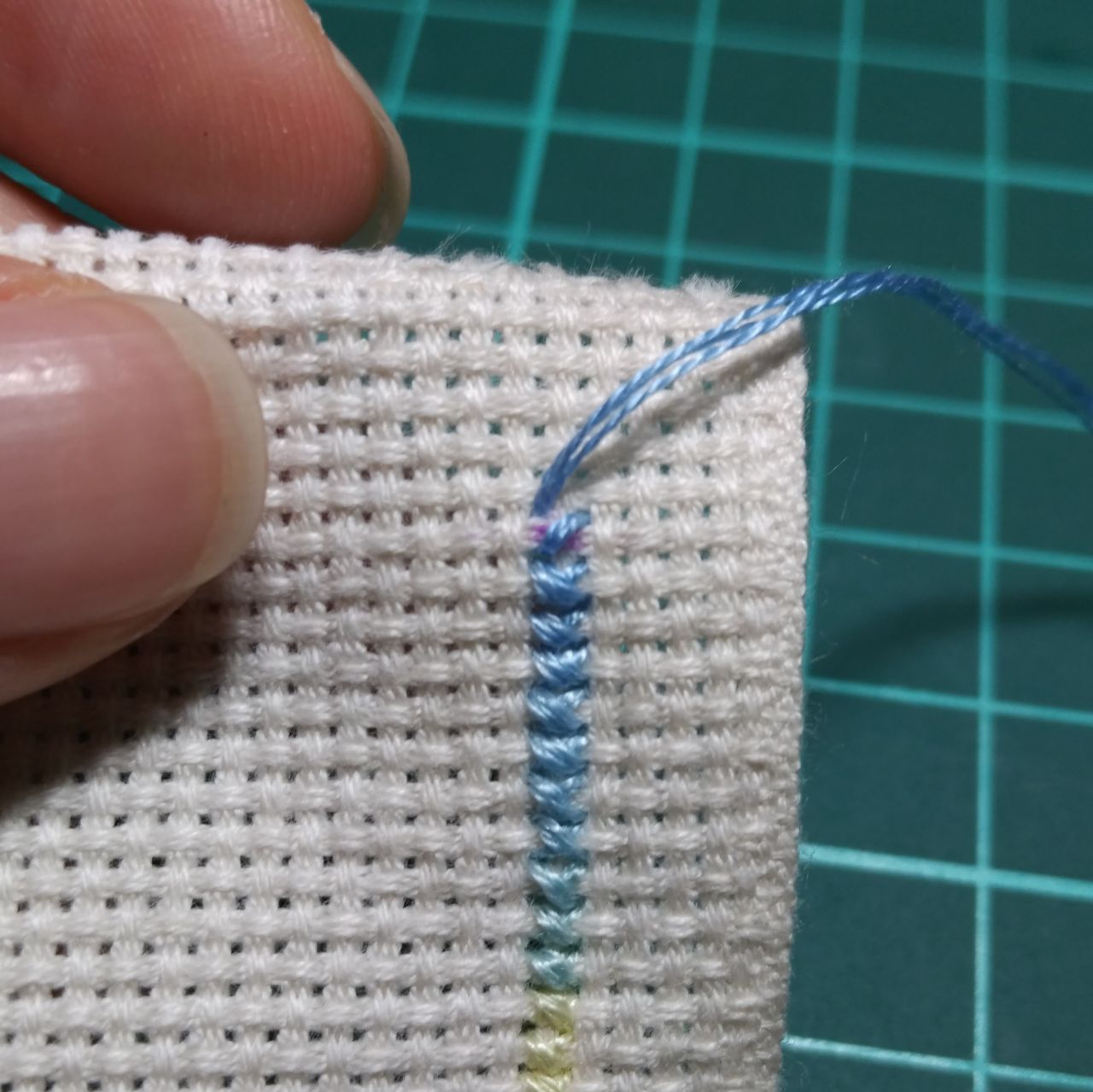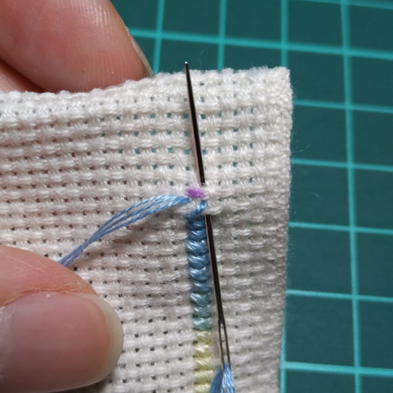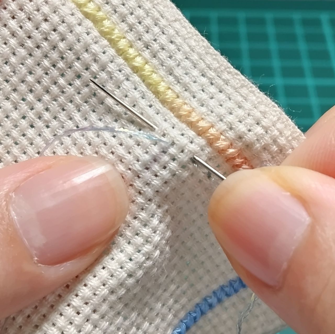 最初だけ、裏から刺すときに余りの糸を絡めていきます。3目進める間、毎回裏に回ったときに絡めると安心です。