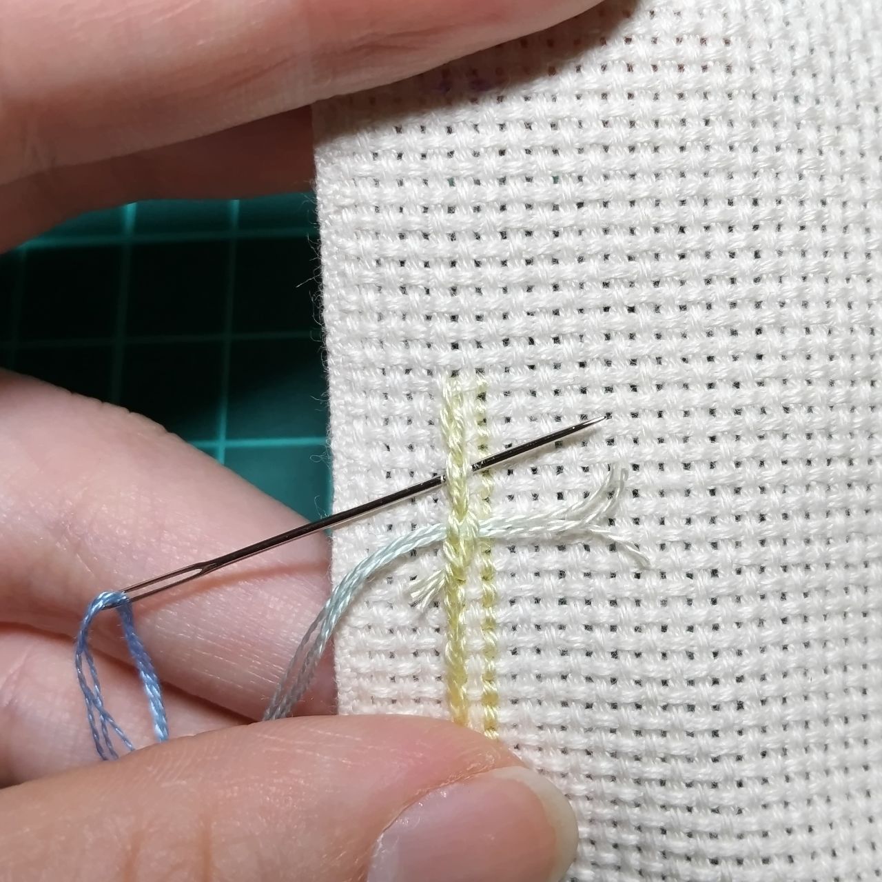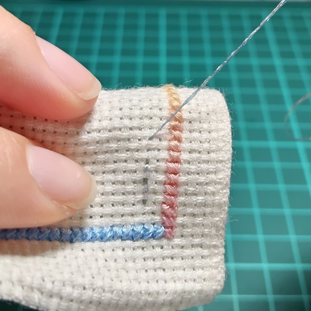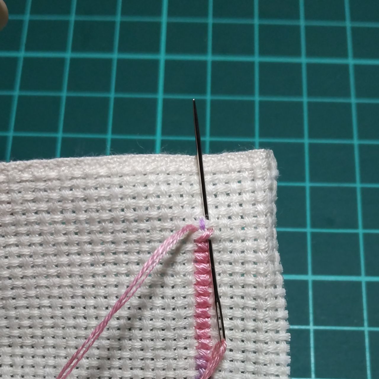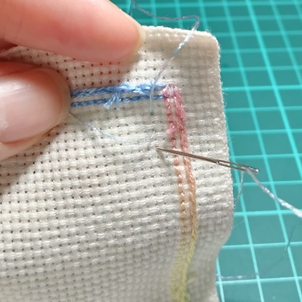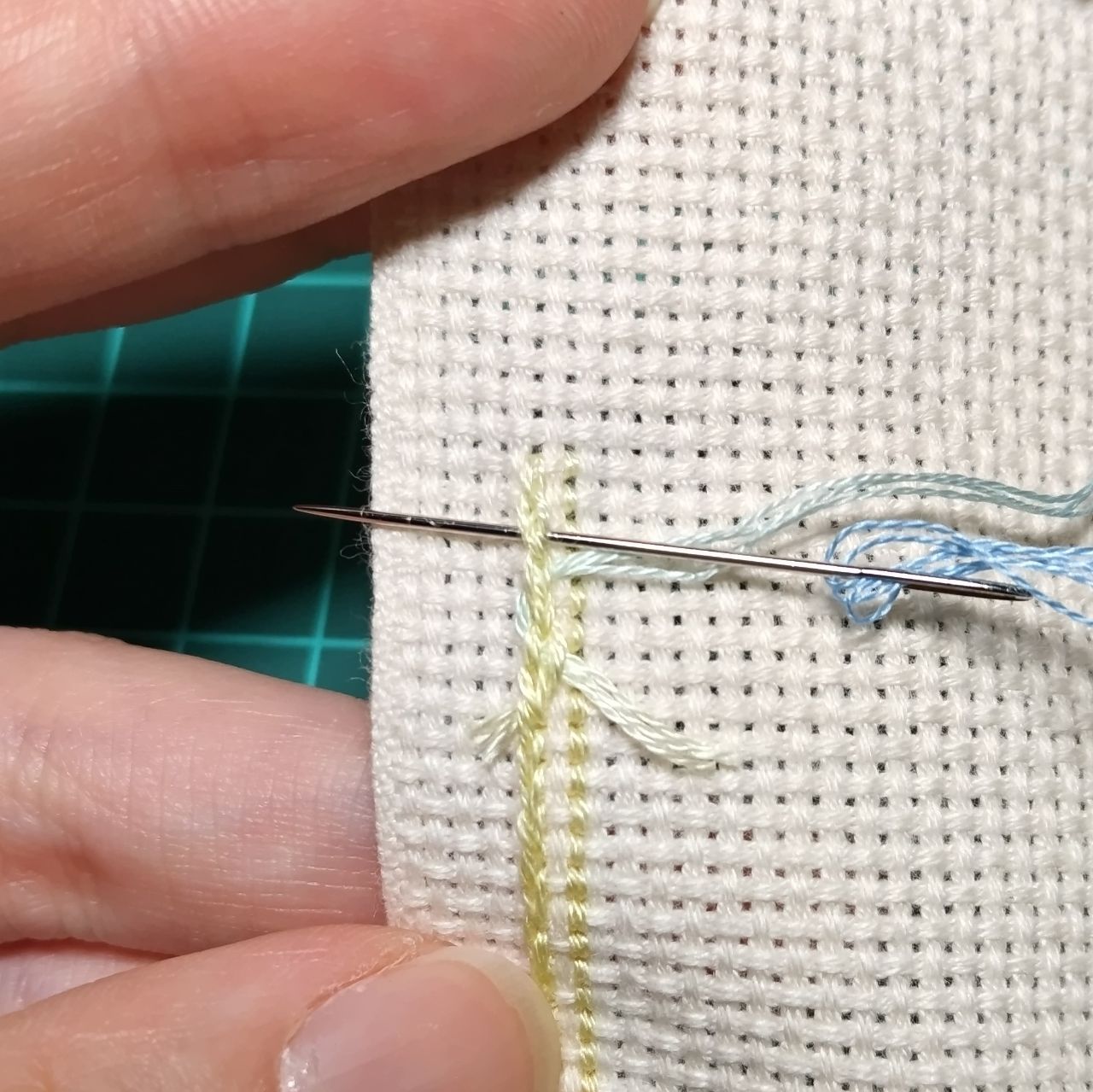 最初だけ、裏から刺すときに余りの糸を絡めていきます。3目進める間、毎回裏に回ったときに絡めると安心です。