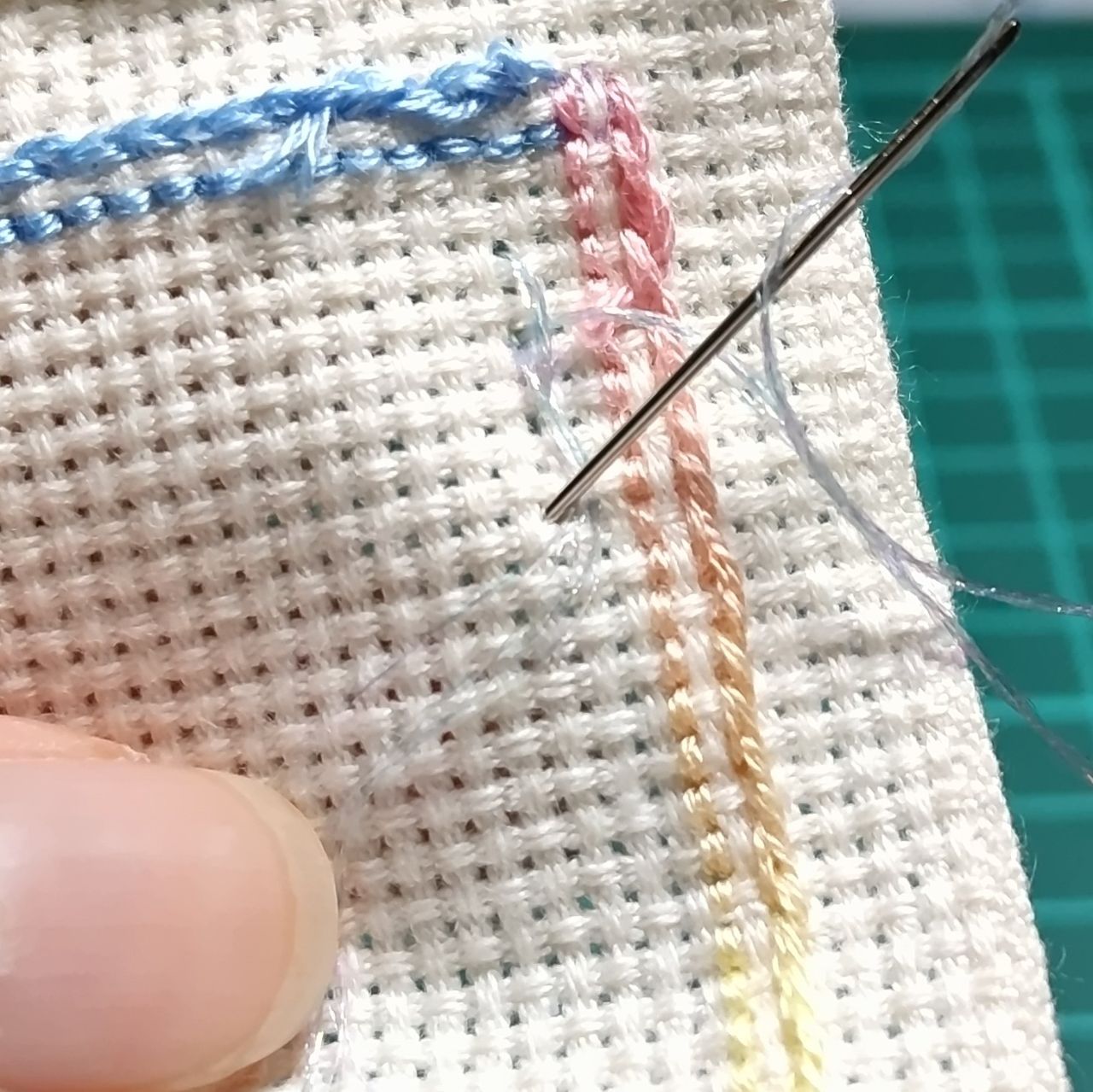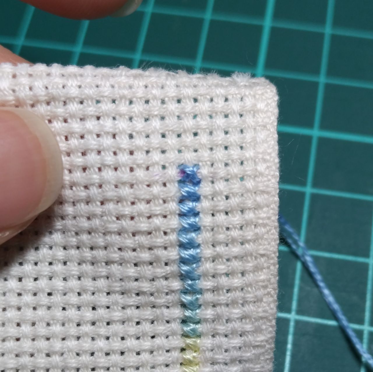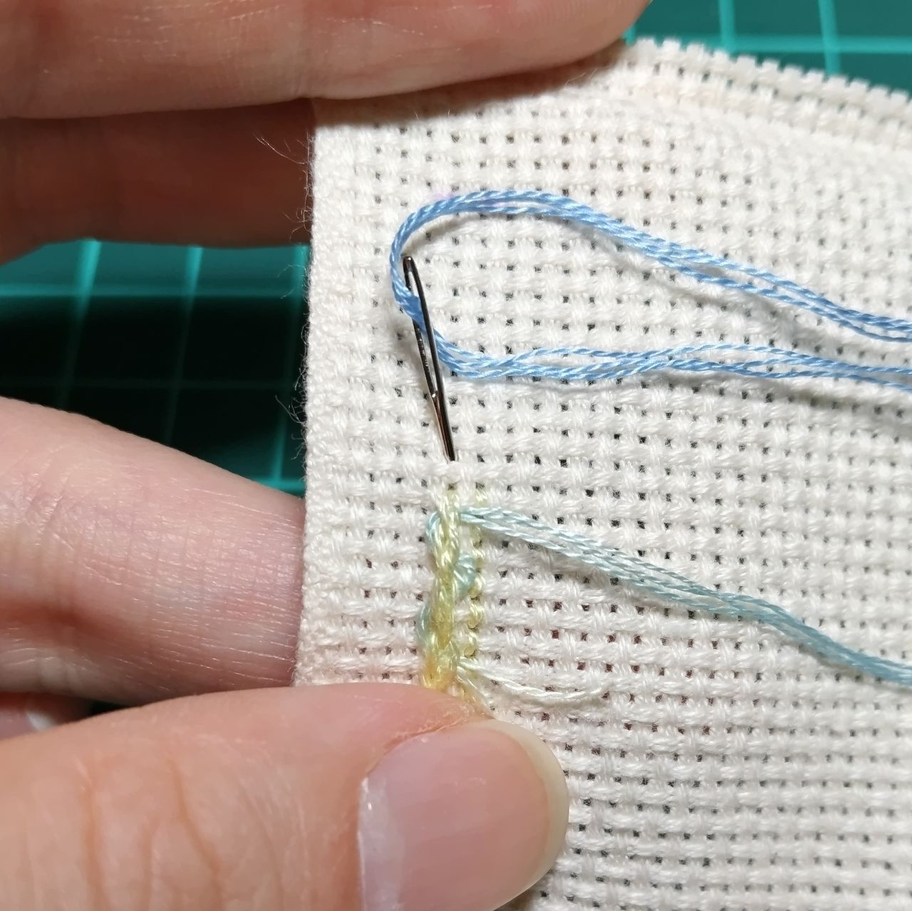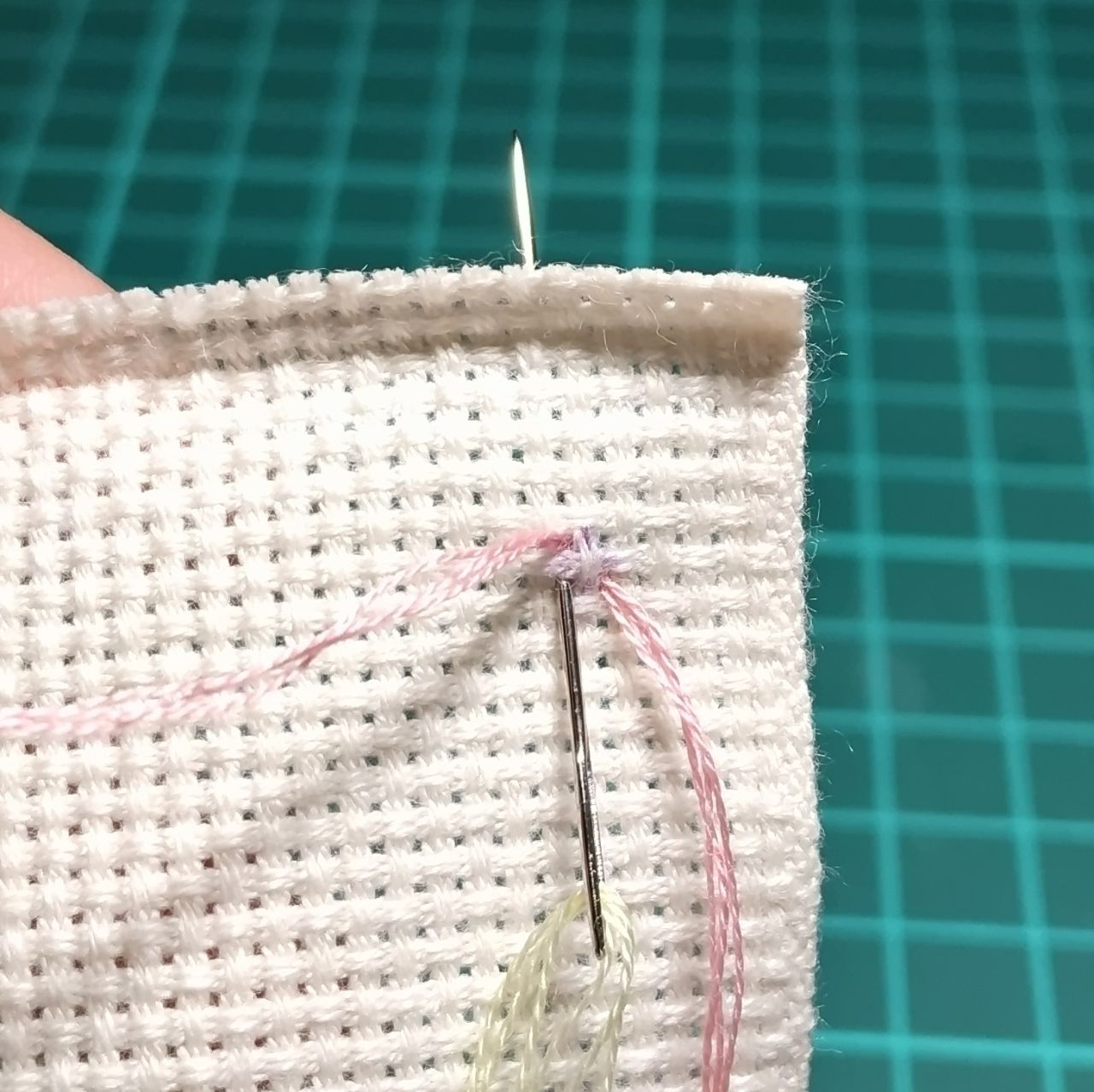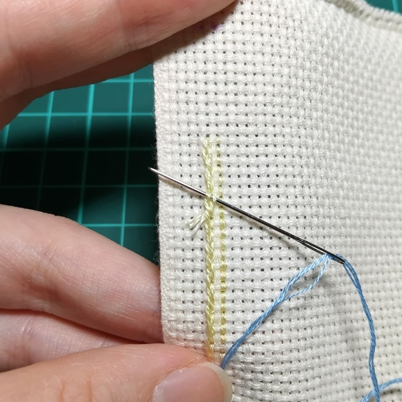 最初だけ、裏から刺すときに余りの糸を絡めていきます。3目進める間、毎回裏に回ったときに絡めると安心です。