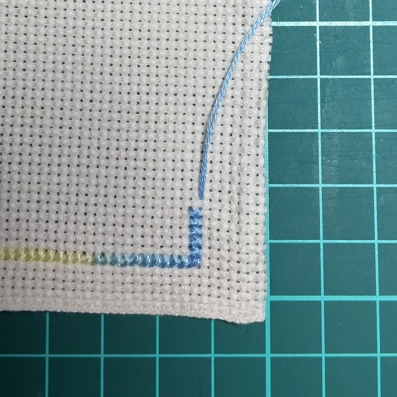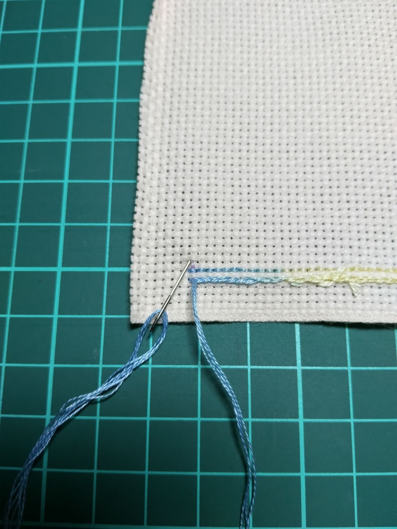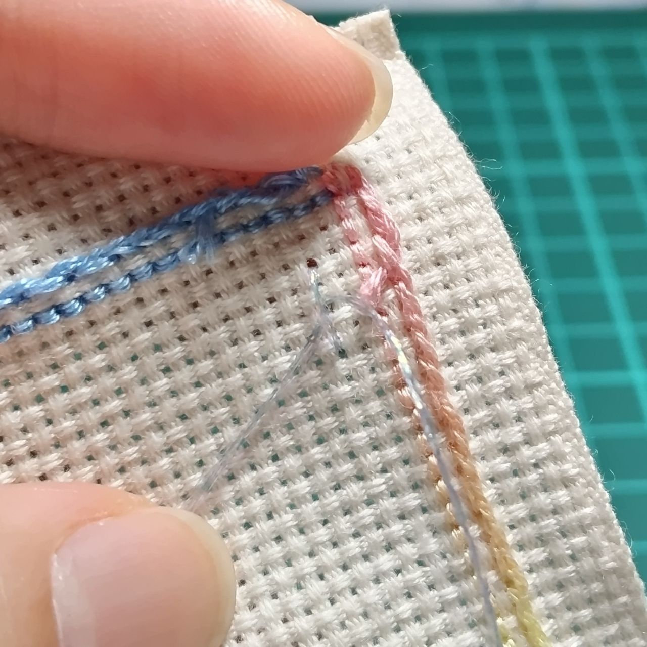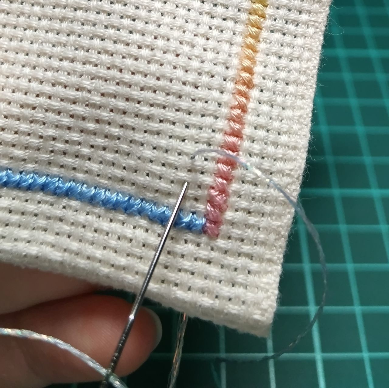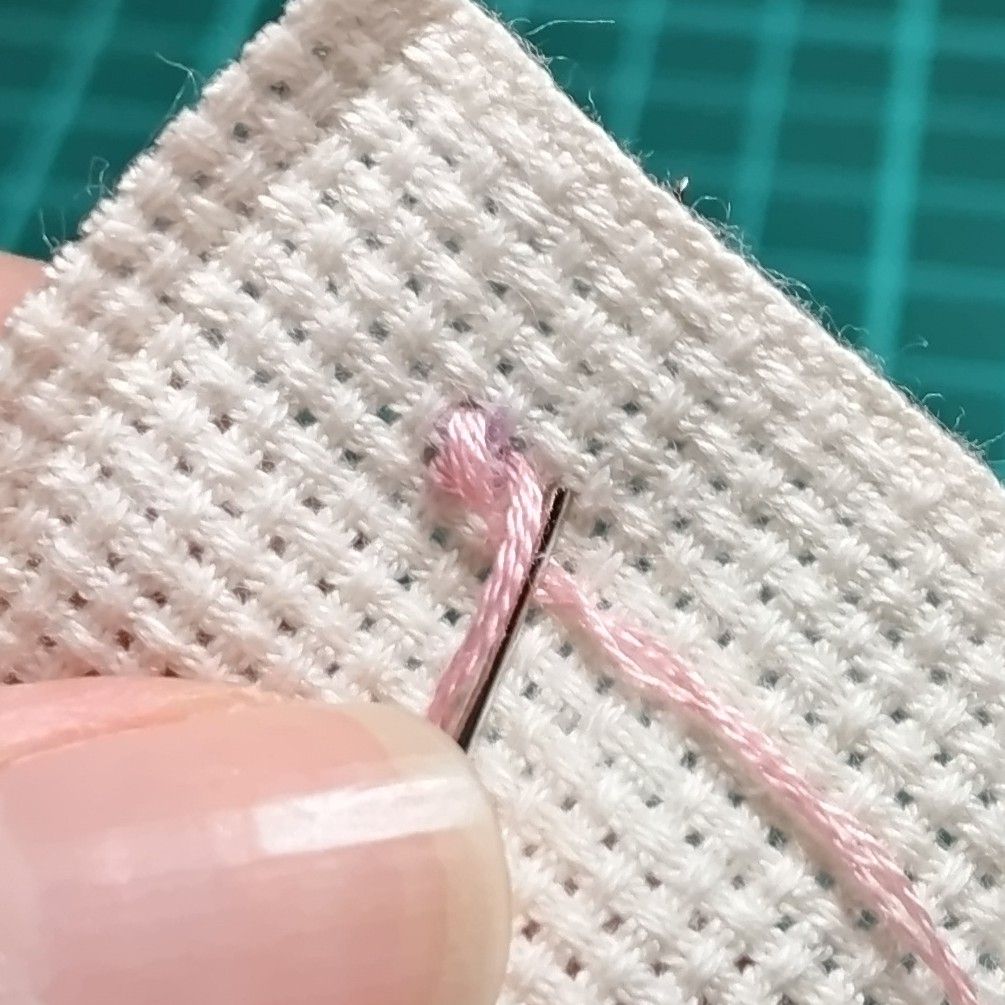 最初だけ、裏から刺すときに余りの糸を絡めていきます。3目進める間、毎回裏に回ったときに絡めると安心です。