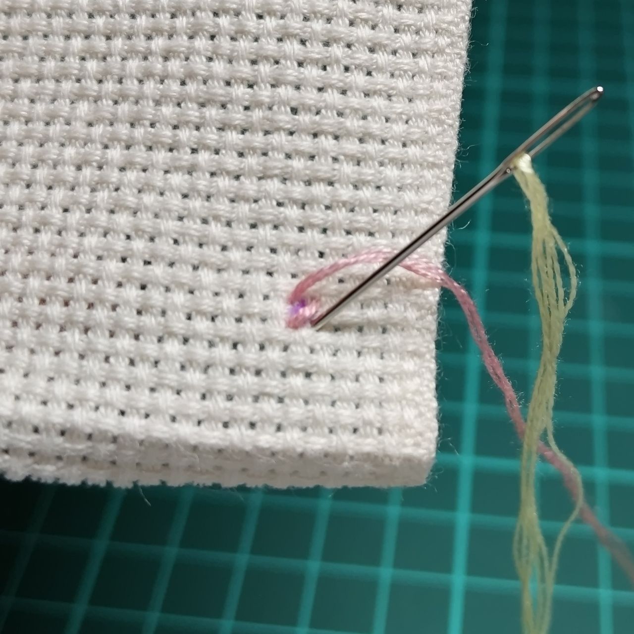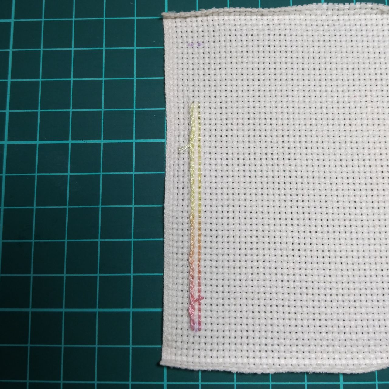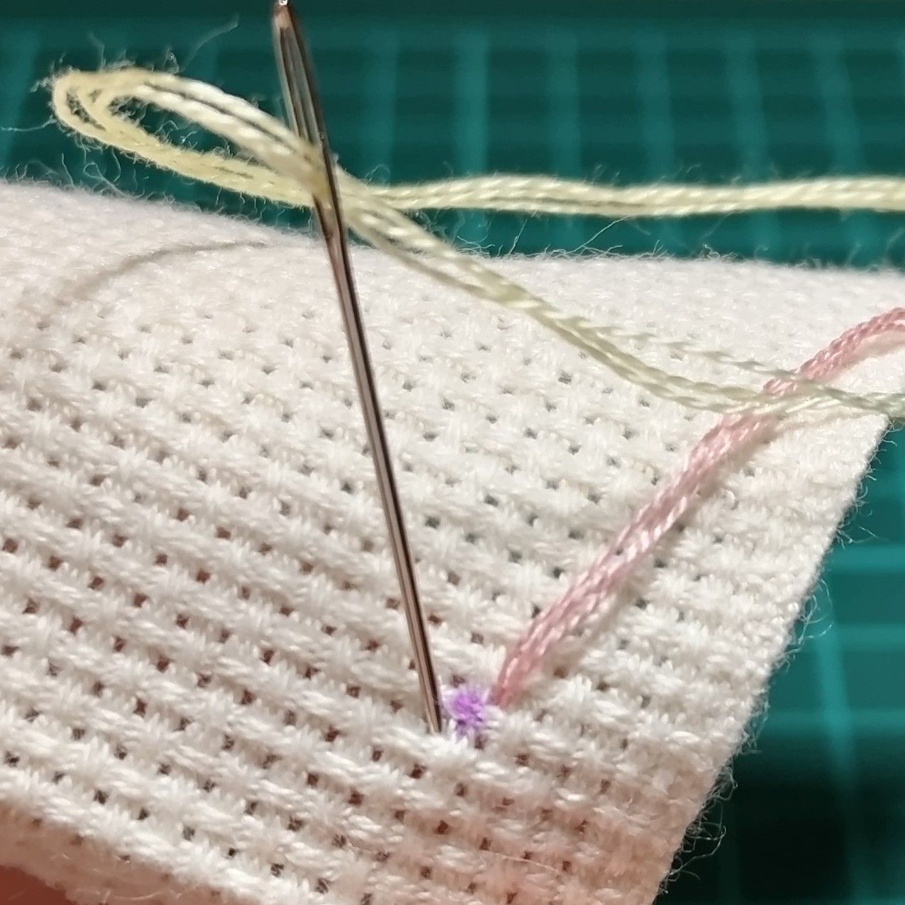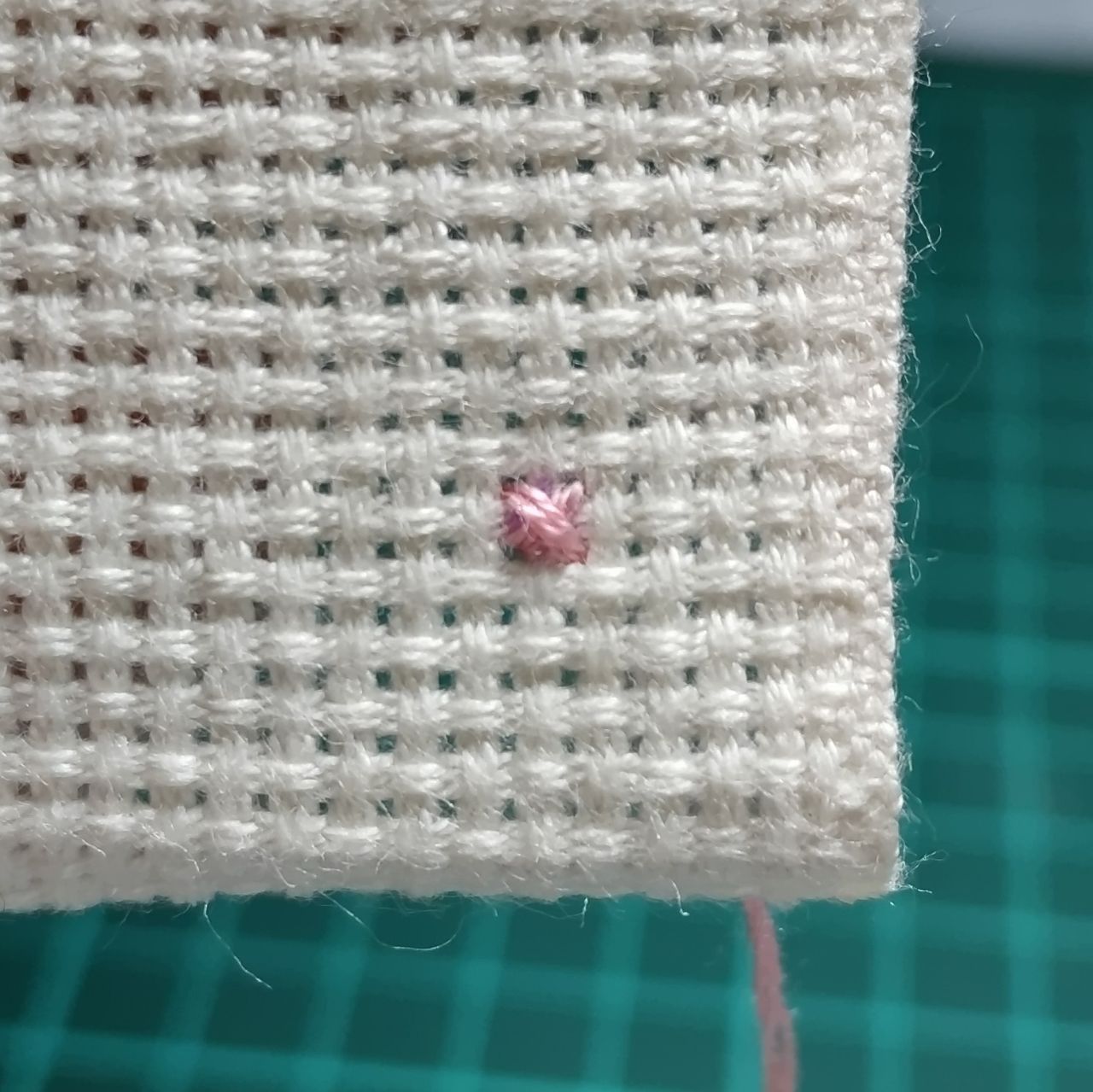 ちくちく進みまして、このあたりで糸が短くなりました。糸は約50cmありましたが、クロスステッチだとあっという間の長さでした。