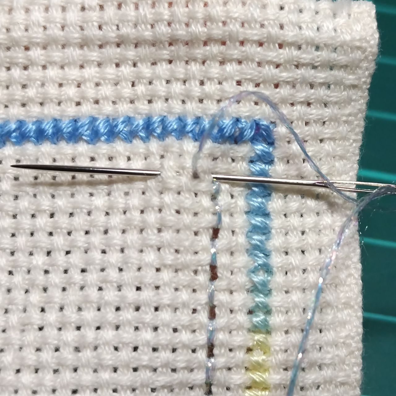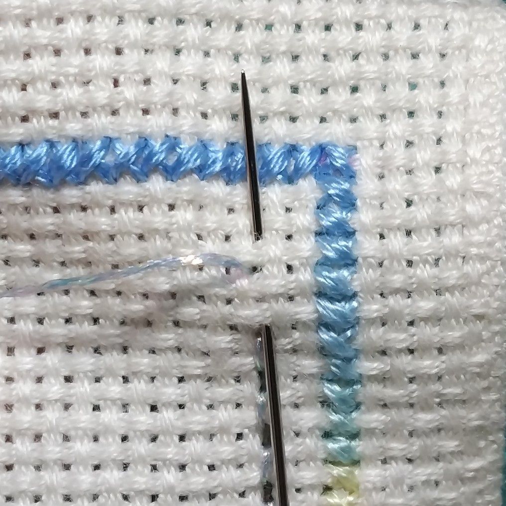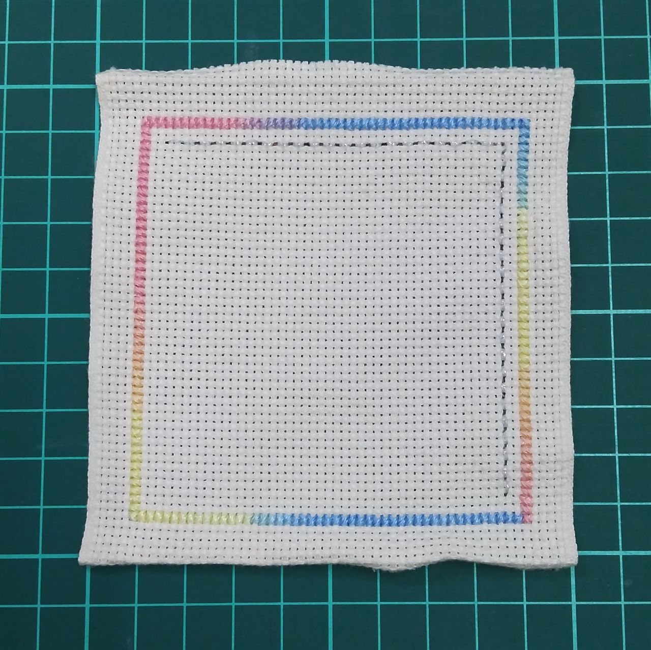 ステッチしたラインから2目分あけた内側にまた四角く刺していくのですが……