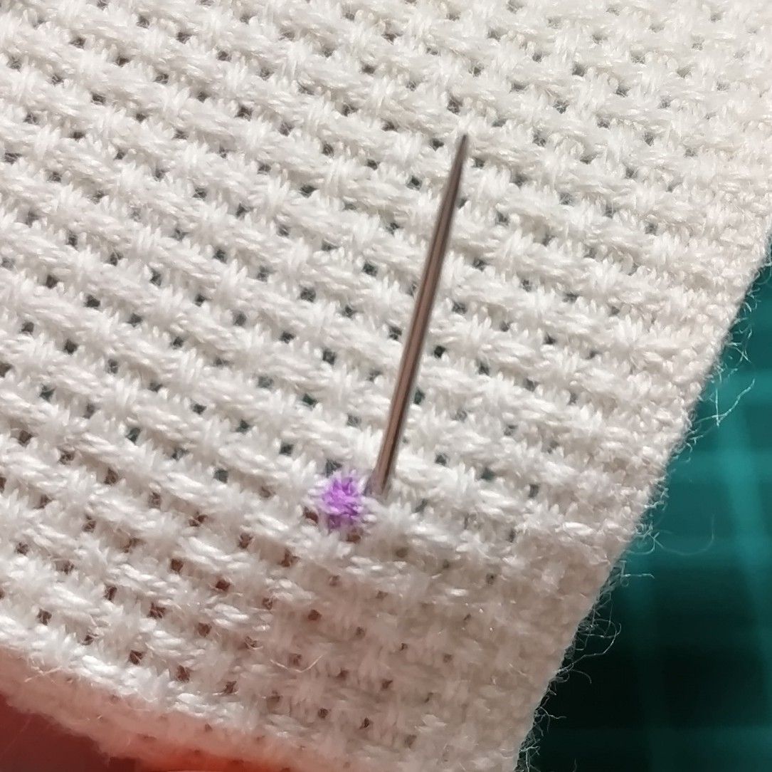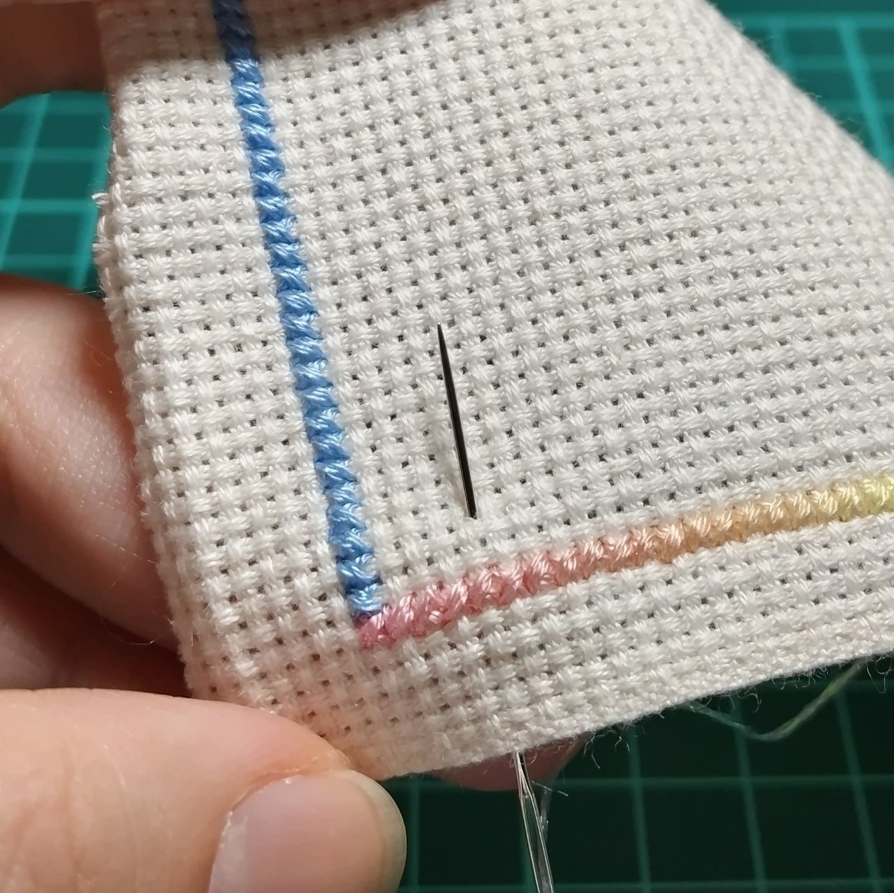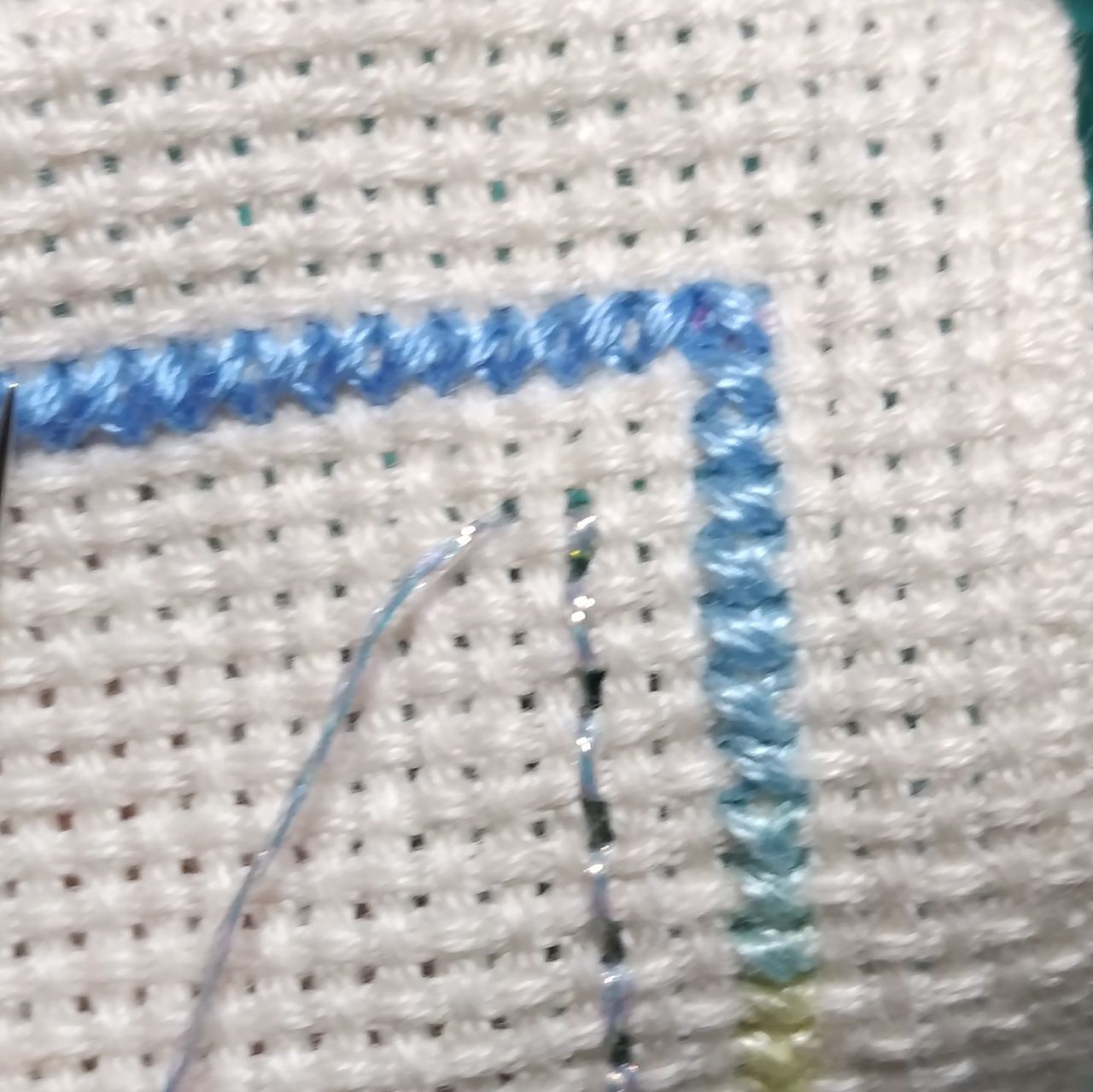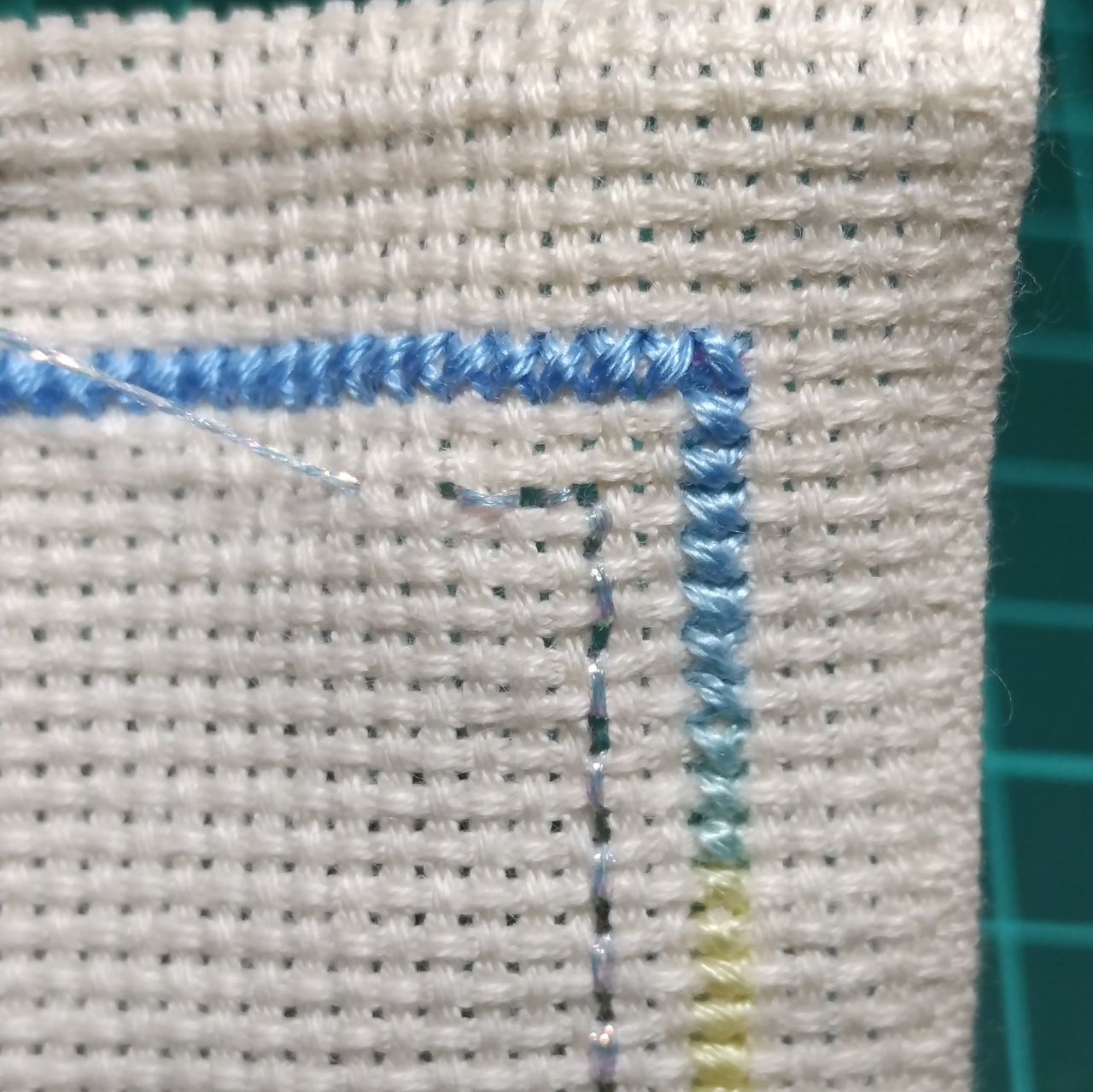 ステッチしたラインから2目分あけた内側にまた四角く刺していくのですが……