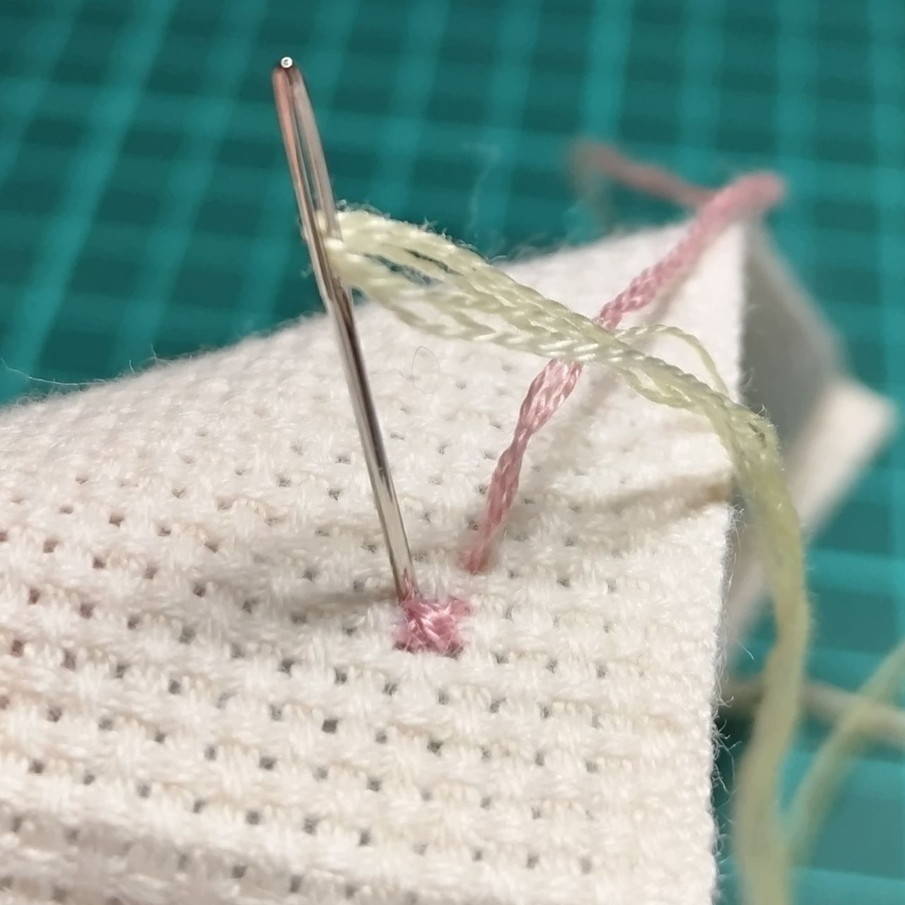 また左上から出して右下へ入ると✕のステッチができました。これまでと同じく進めていきます