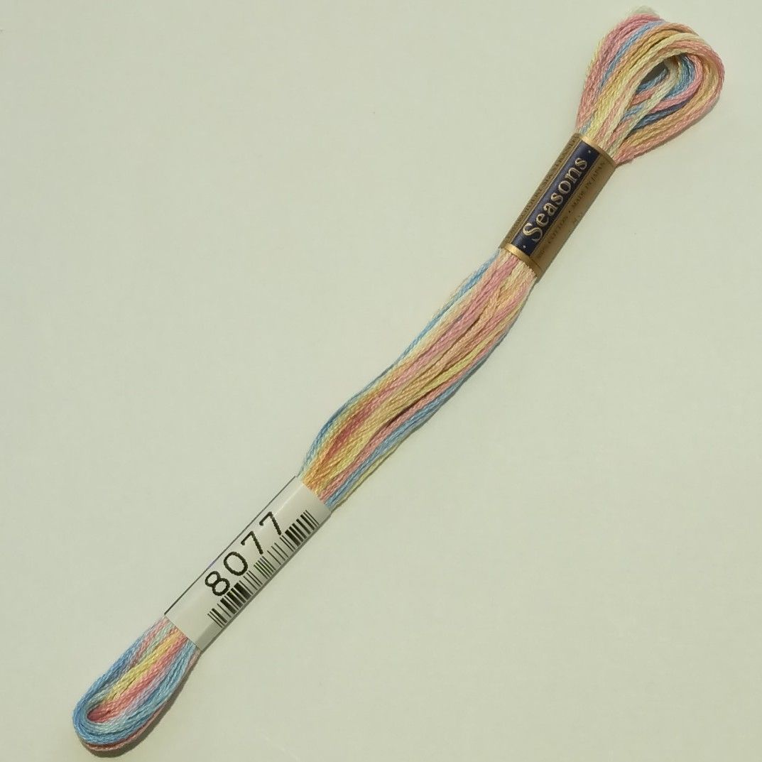 シーズンズ8000はゆるやかに色が変化していきます。今回使用のマルチカラータイプや同系色の濃淡など、多彩なグラデーションが魅力的な25番糸です!
