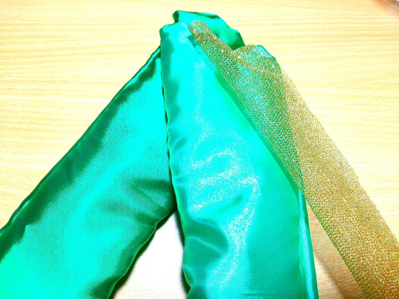 3、2、の筒2本とラメWチュールの端を縫い留めます。