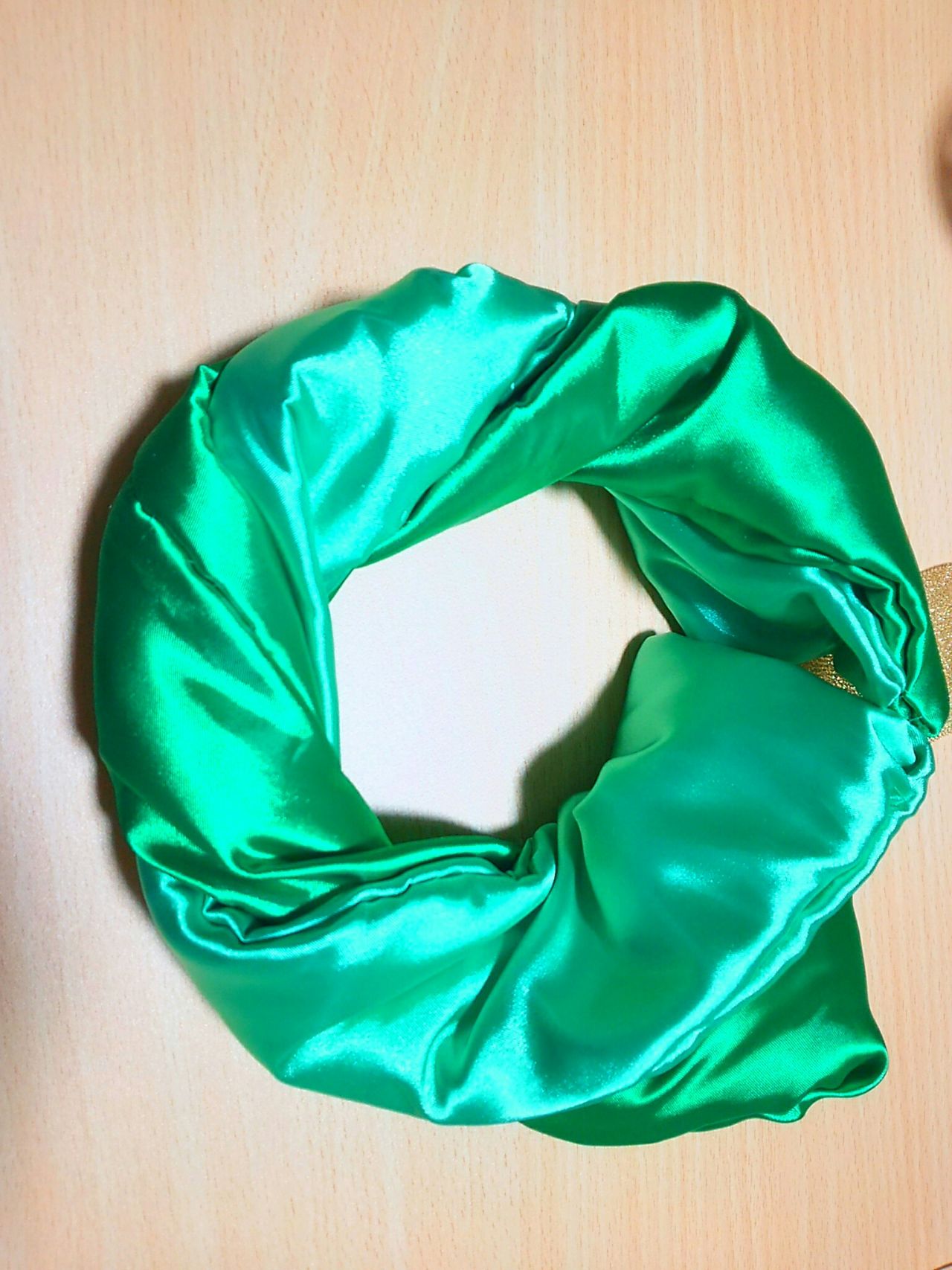 3、サテンの筒2本を輪になるようにねじります。形が整ったら、先端同士を縫い合わせます。