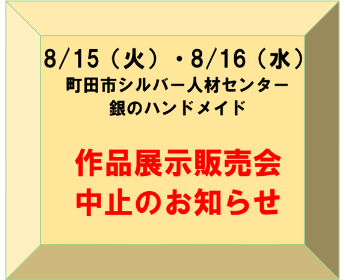 8月15日(火)16日(水)に町田店1F店頭で開催を予定しておりました町田市シルバー人材センターの『銀のハンドメイド』の手作り作品展示販売会&オカダヤ町田店手作りサンプル作品販売会は台風による悪天候が予想されるため中止とさせて頂くことになりました。