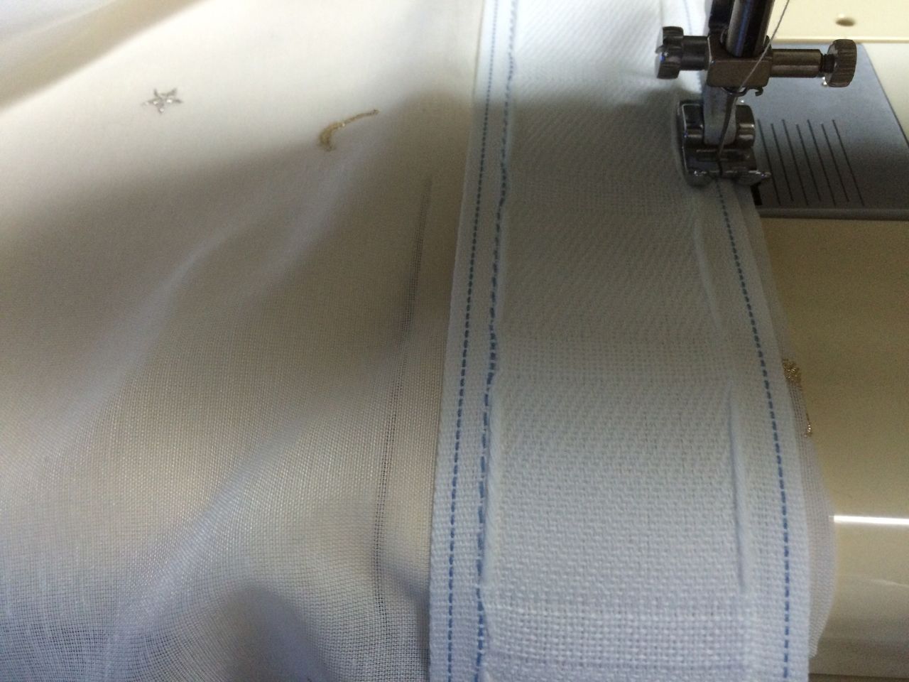 ①生地の横はミミを利用し、上・下は三つ折りにして、ミシンをかけ、端の処理をする。その後、カーテンフックを付けるためにカーテンテープを縫い付ける。