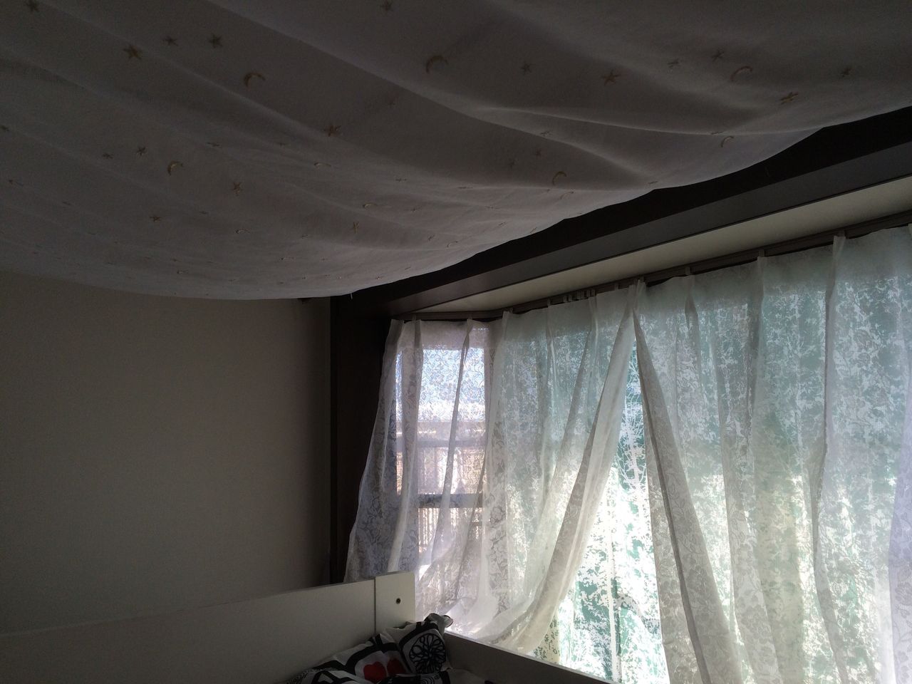 今回は、カーテンレールを利用して天蓋を吊るしましたが、天井に強度があれば、