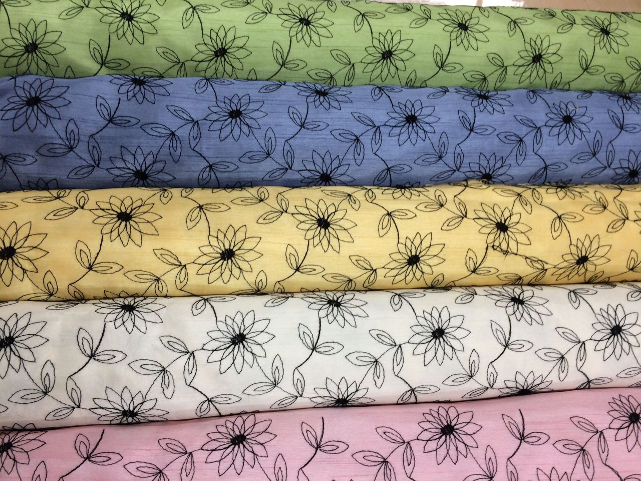 こちらは、花柄の刺繍です。ポリエステル100%・生地巾100㎝巾、¥2,800+税/1m、お色は5色展開です。