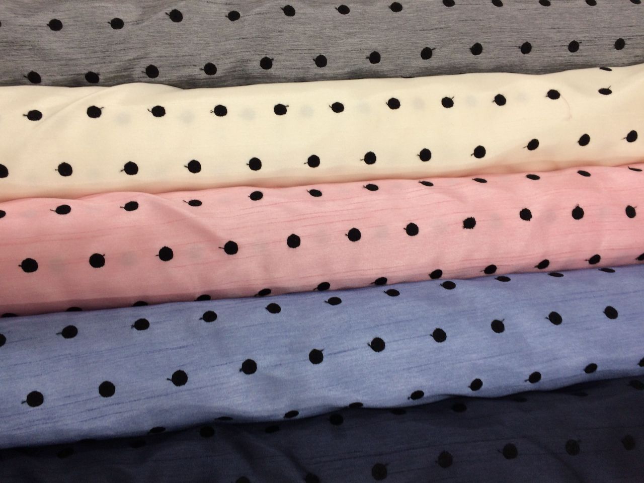 こちらは、ドットの刺繍です。ポリエステル100%・生地巾100㎝巾、¥2,800+税/1m、お色は5色展開です。