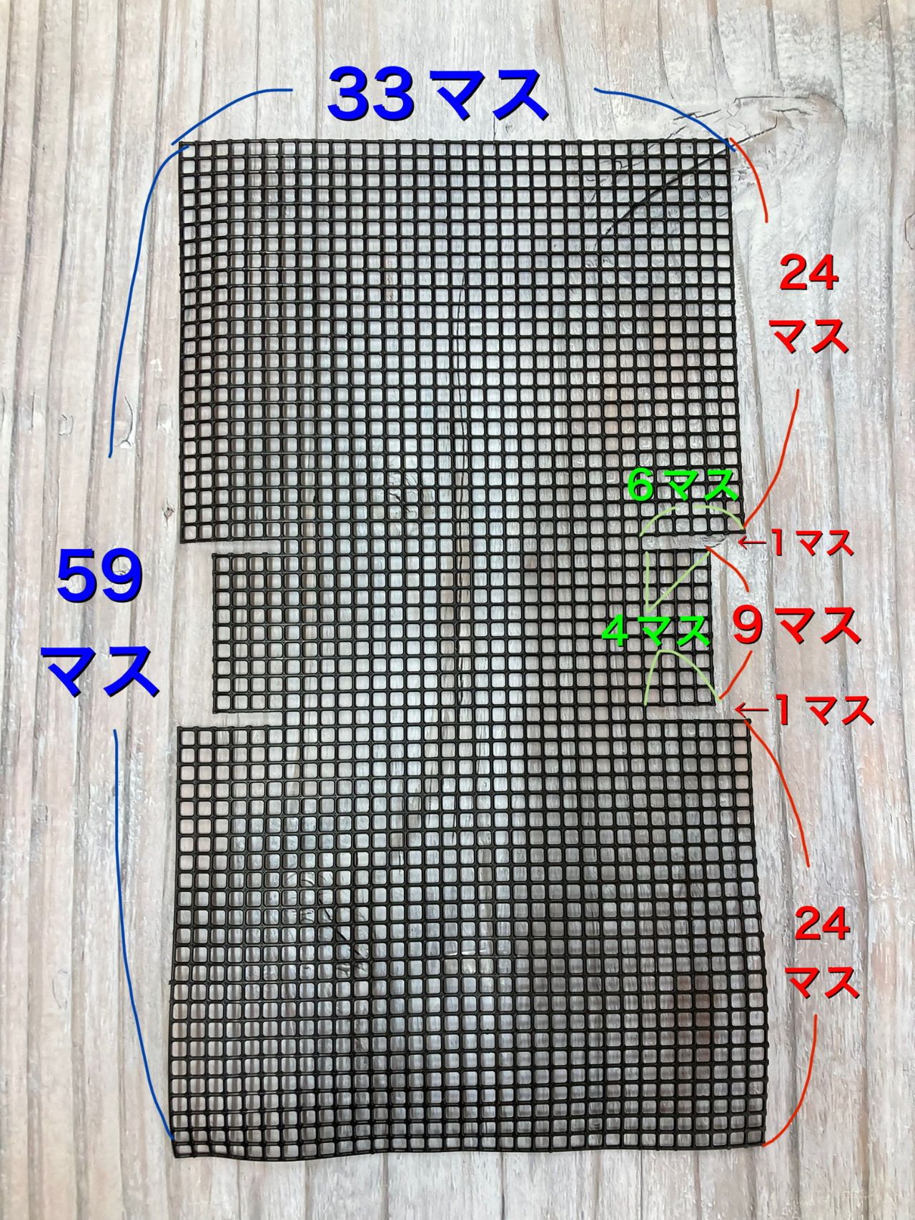 ネットの端から6マスあけ、7マス目の裏から通します。(通し始めは10cmほど残します。)
