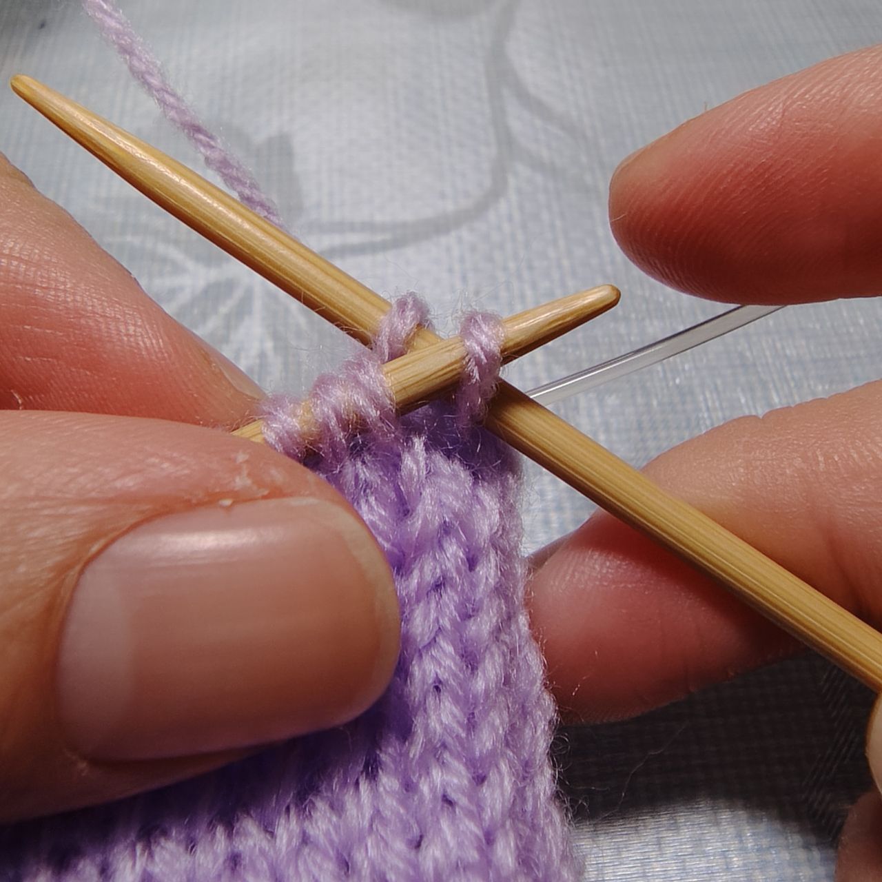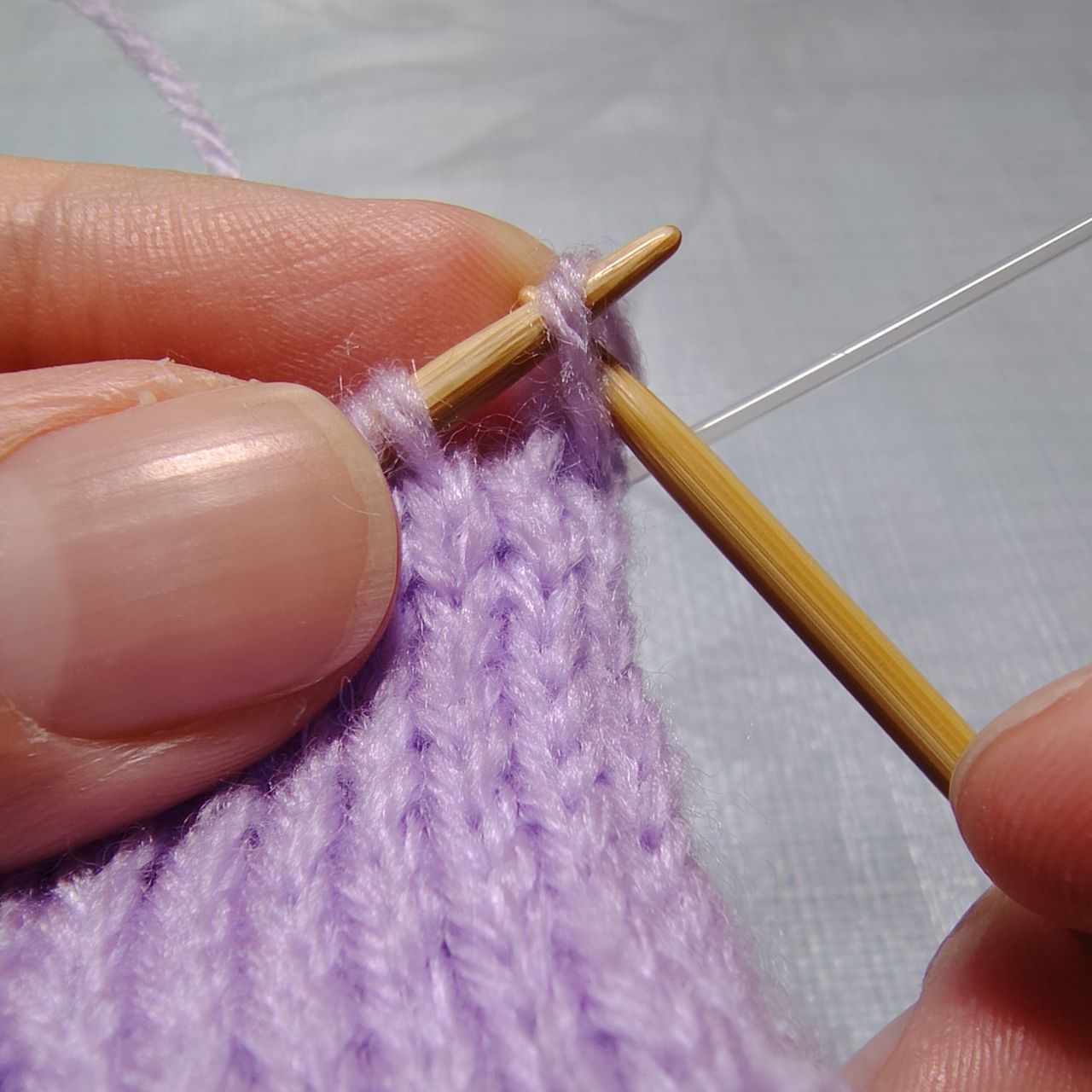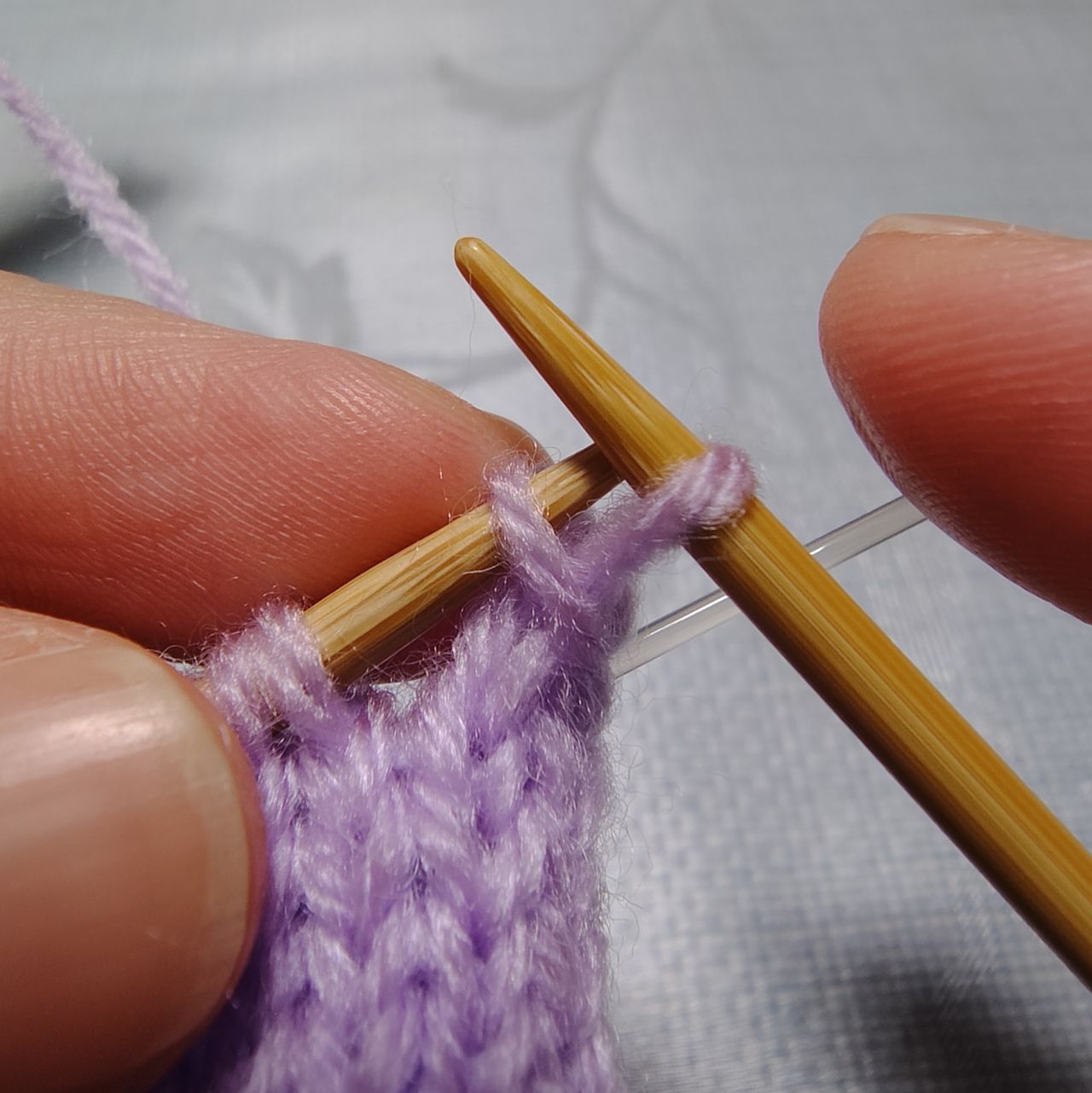 表目を2目編み、左の針を右の目に入れます。