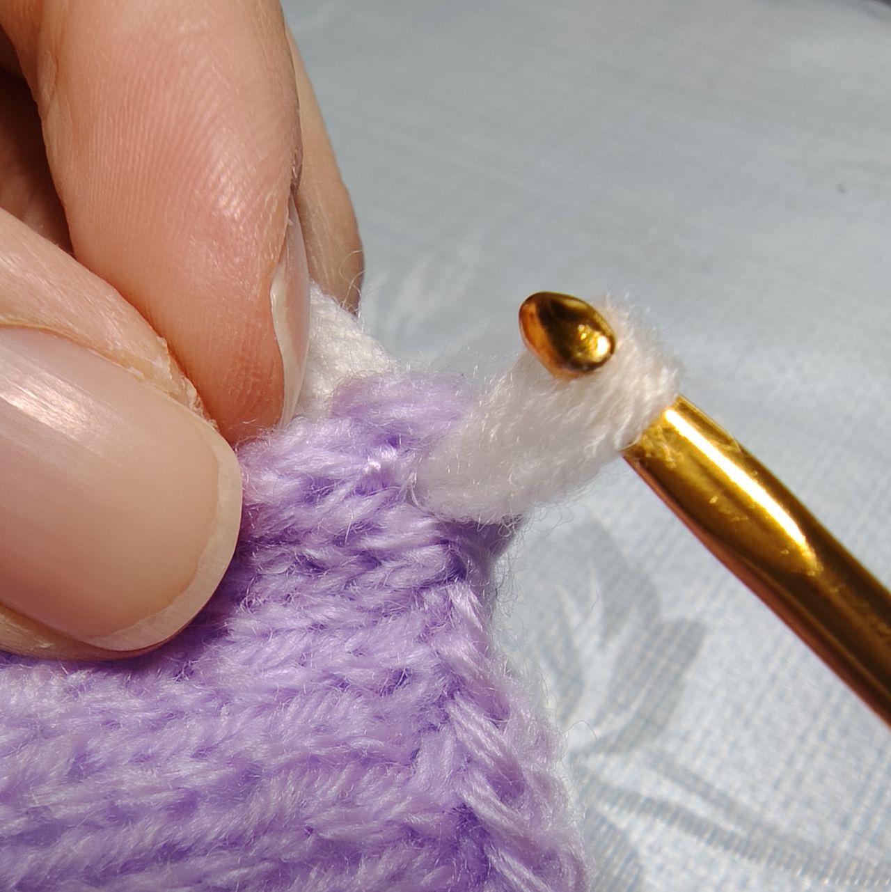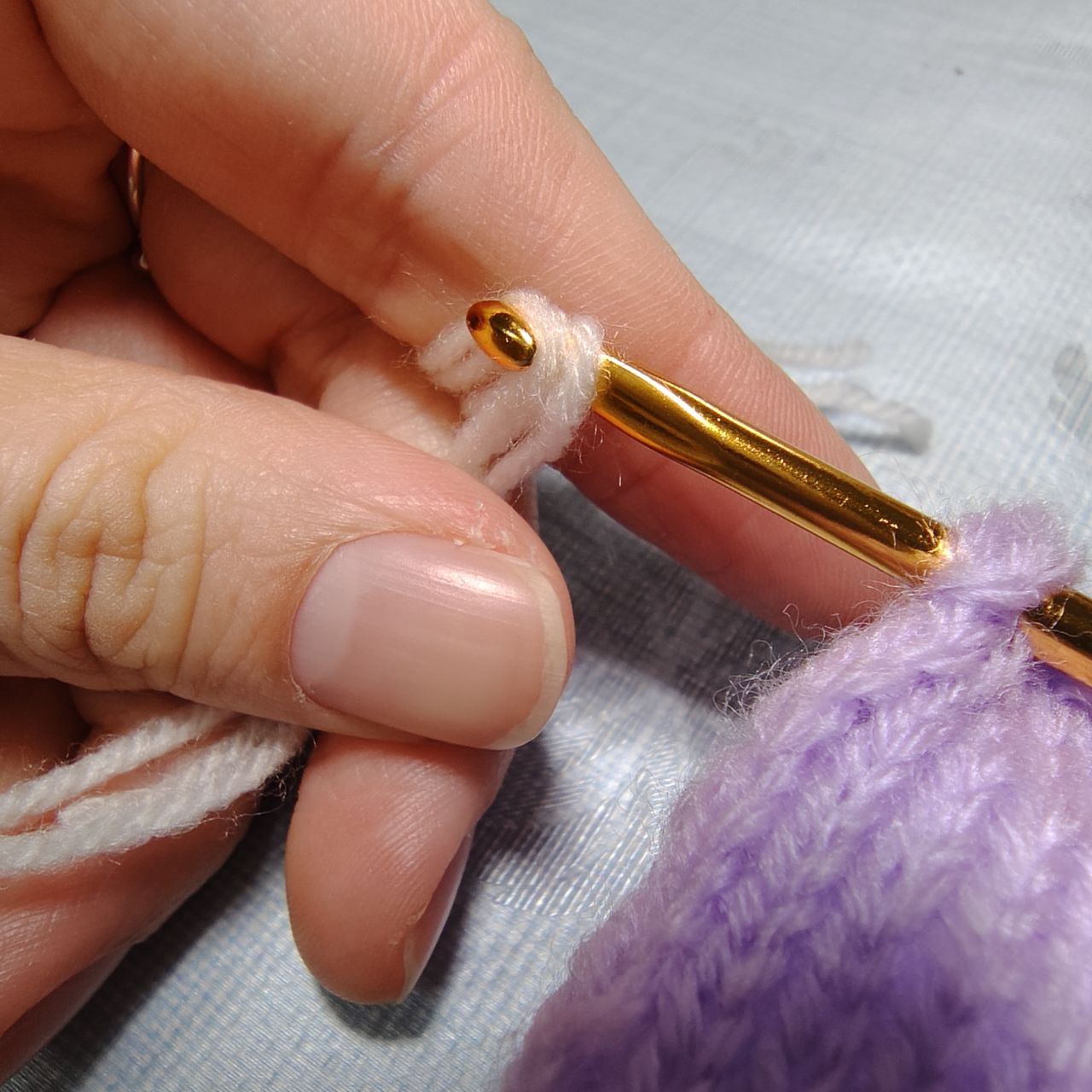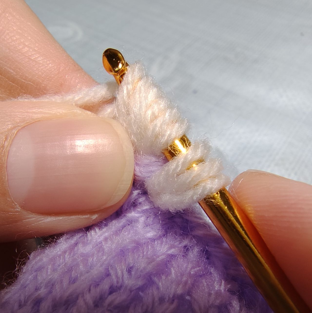 輪はそのまま、もう一度かぎ針に揃えた糸をかけます。