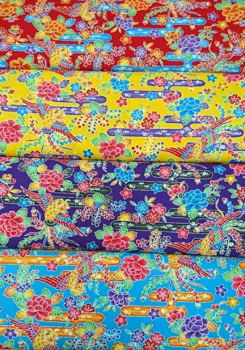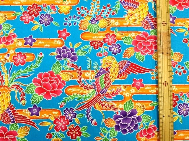 様々な植物や鳳凰がカラフルに描かれた生地、