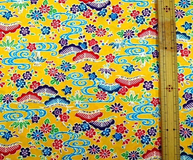 松竹梅や小花、流水がプリントされた華やかな生地です。
