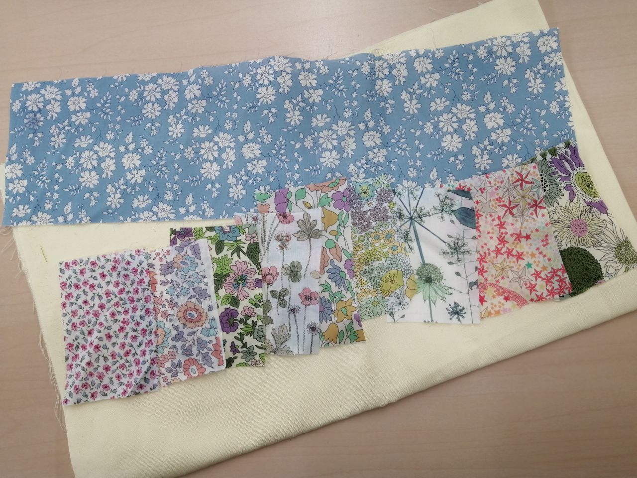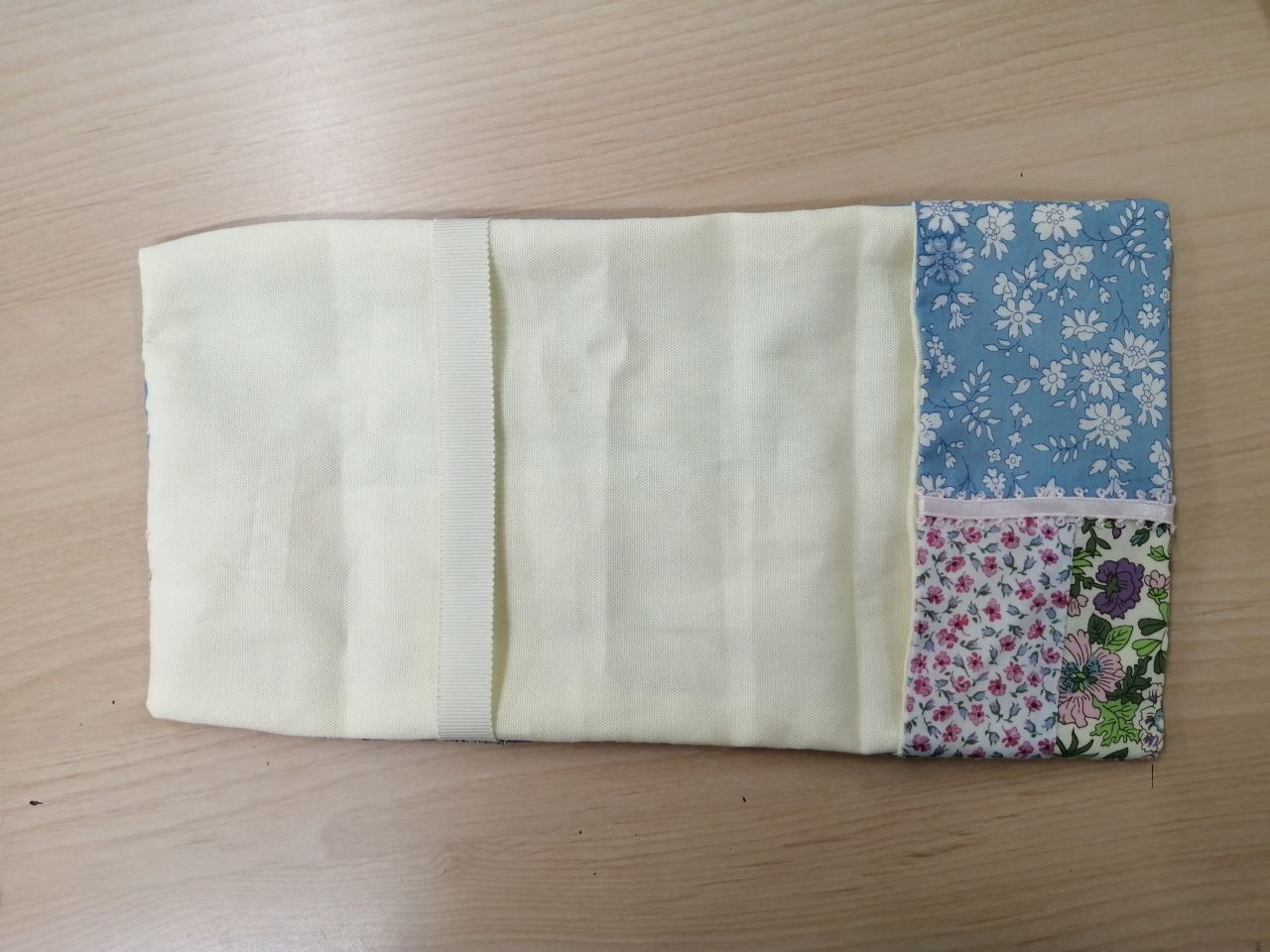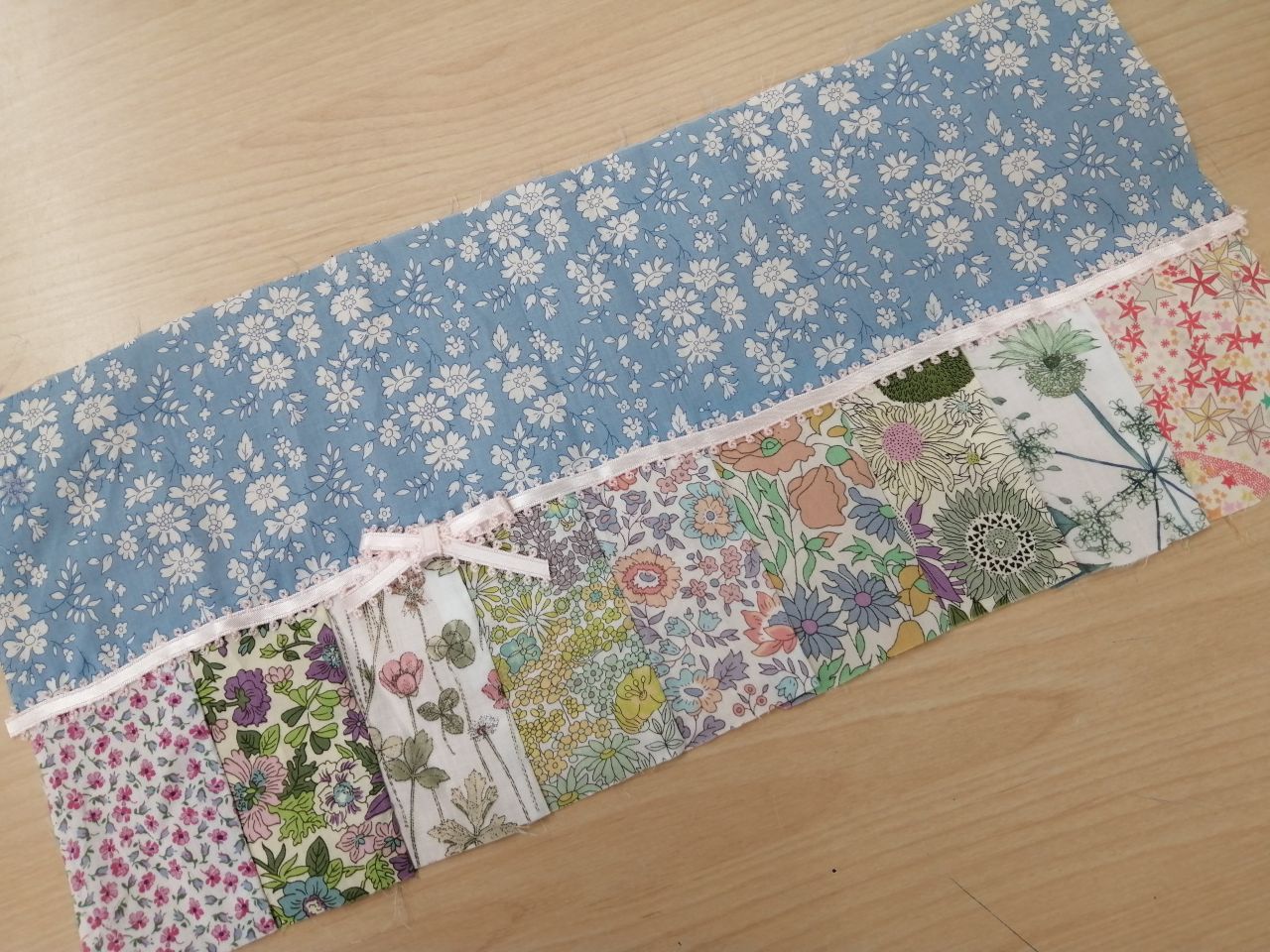 今回は表布をパッチワークにしたので、お手持ちのあまり布などでもつくれますし、パッチワークはめんどう…と言う方は一枚布でも。